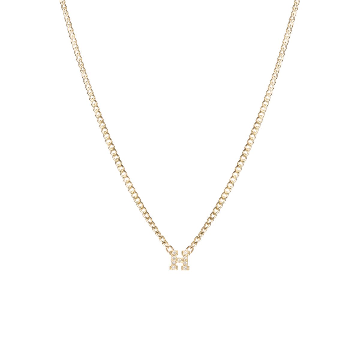 14k gold single letter necklace covered with white pave diamonds on x-small curb chain