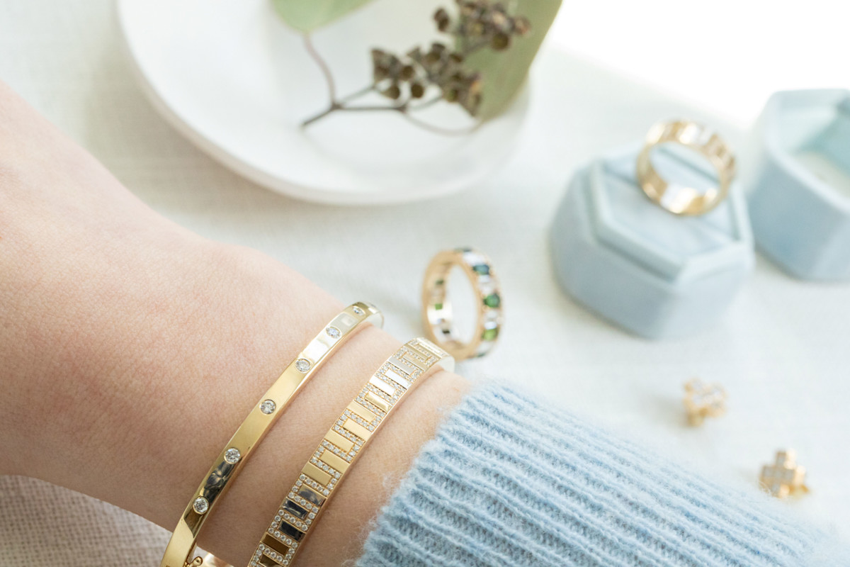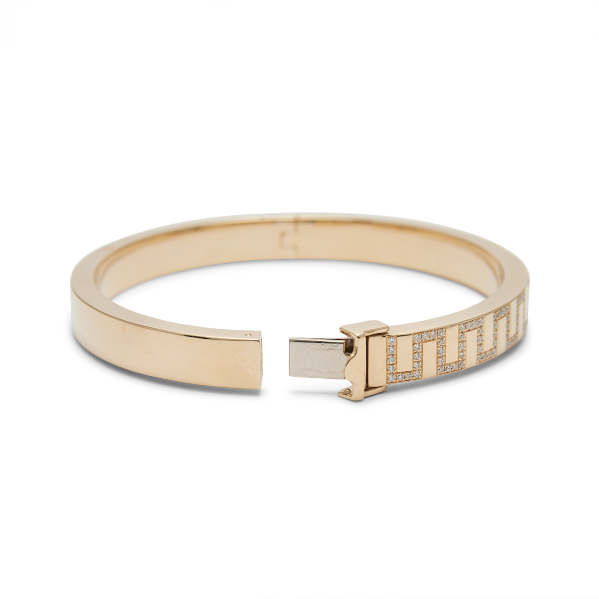 The NEW Athena Diamond Pave Bangle, designed in collaboration with Erin Gates, featuring a Greek Key motif of pave diamonds set in 14K gold is directly inspired by Erin’s interior designs. We love stacking this solid gold bracelet with the Les Points Bangle and other gold bracelets.