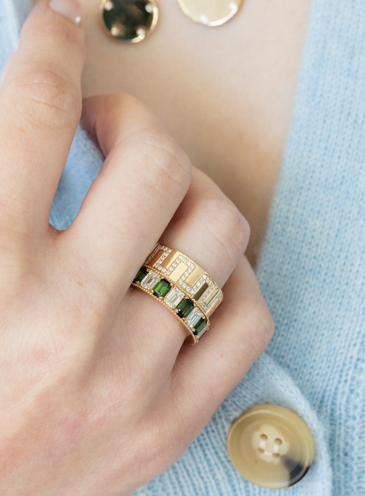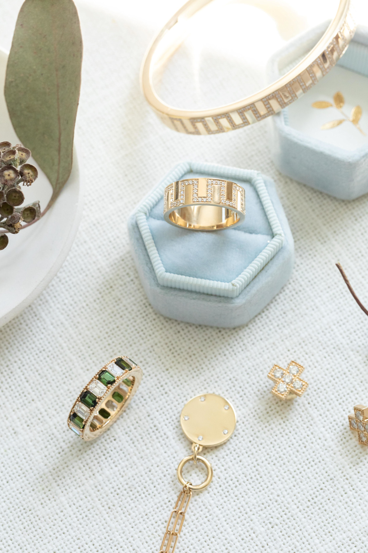 The New Athena Diamond Pave Band, Designed In Collaboration With Erin Gates, Featuring a Greek Key Motif Of Pave Diamonds Set In 14K Gold Is Directly Inspired By Erin’s Interior Designs. We Love The Look Of The Wide Gold Band With The Subtle Diamond Sparkle.