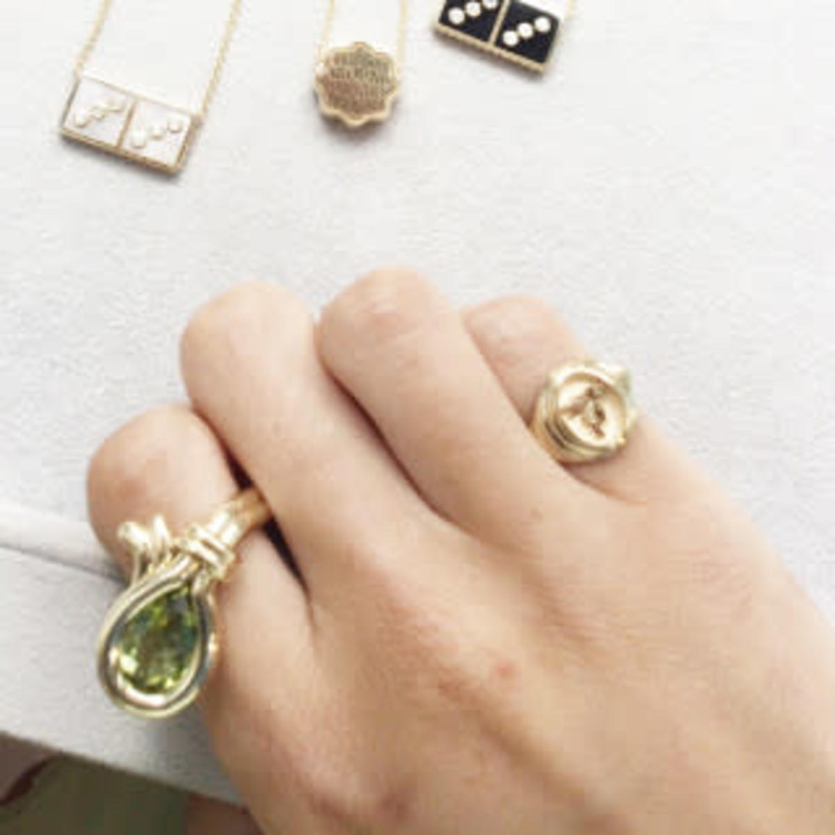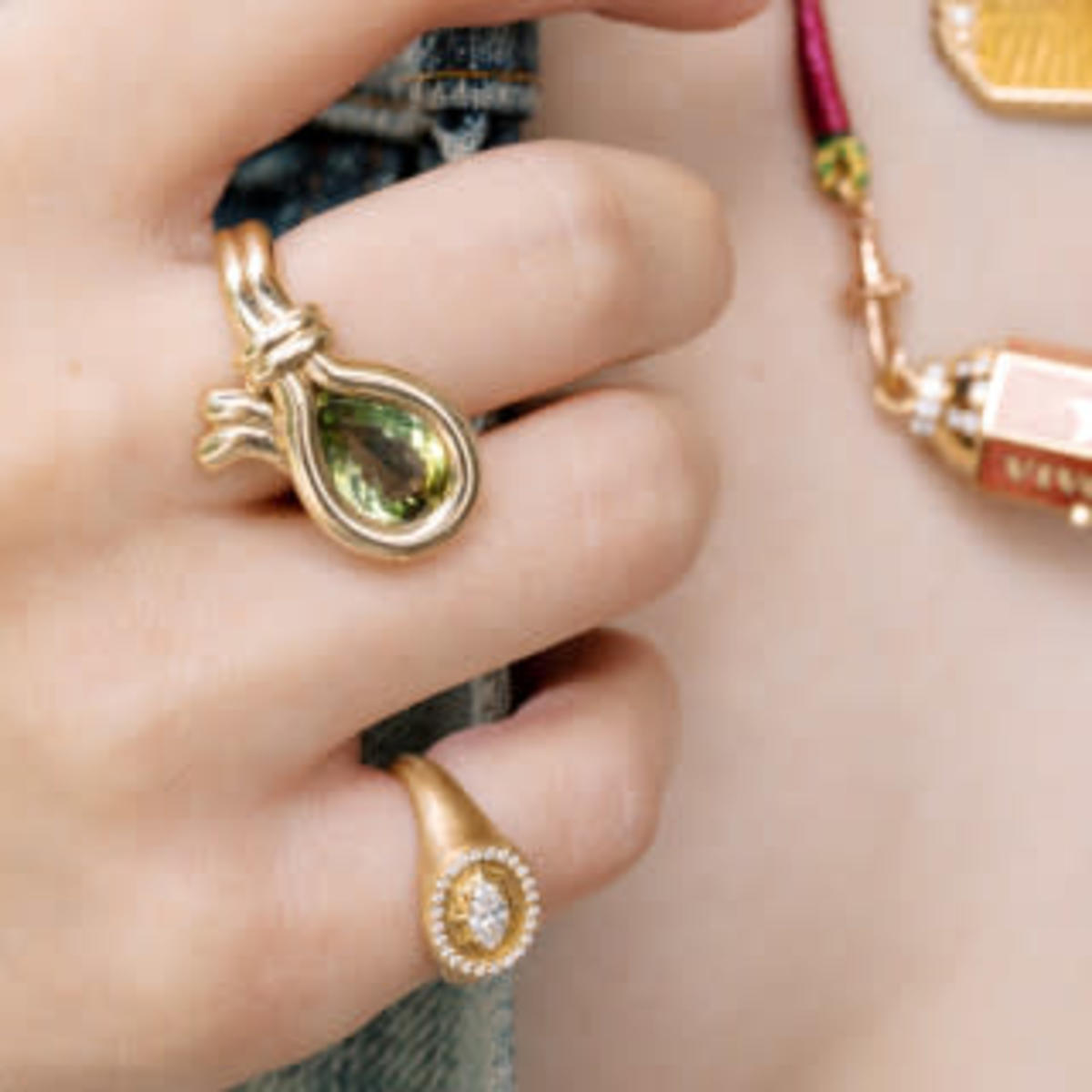 A One of a Kind Loop Ring with a Pear Cut 3.09 Green Tourmaline in 14K Yellow Gold