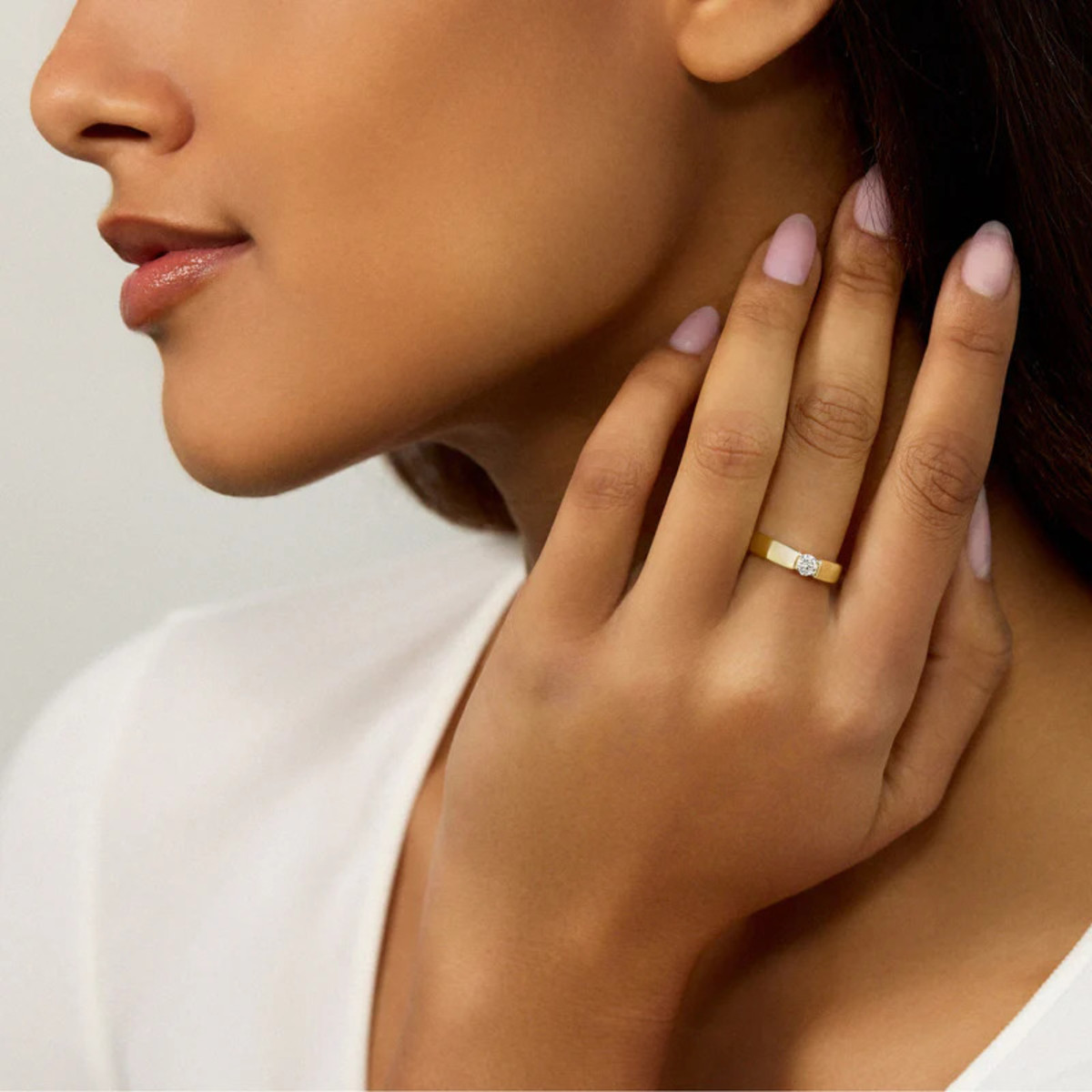 The Honey Ring by Melissa Kaye features a single diamond set in a yellow gold band. This ring is a timeless classic with a twist, and is so easy to wear!