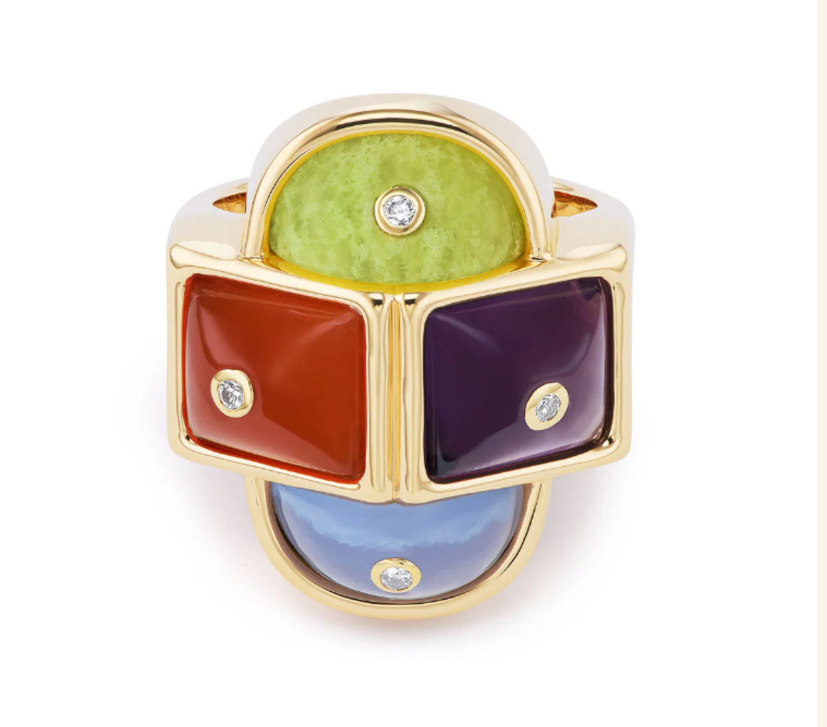 Hopscotch Cocktail Ring in Brazilian Opal, Carnelian, Amethyst, Blue Chalcedony and Dimond Rounds in Size...