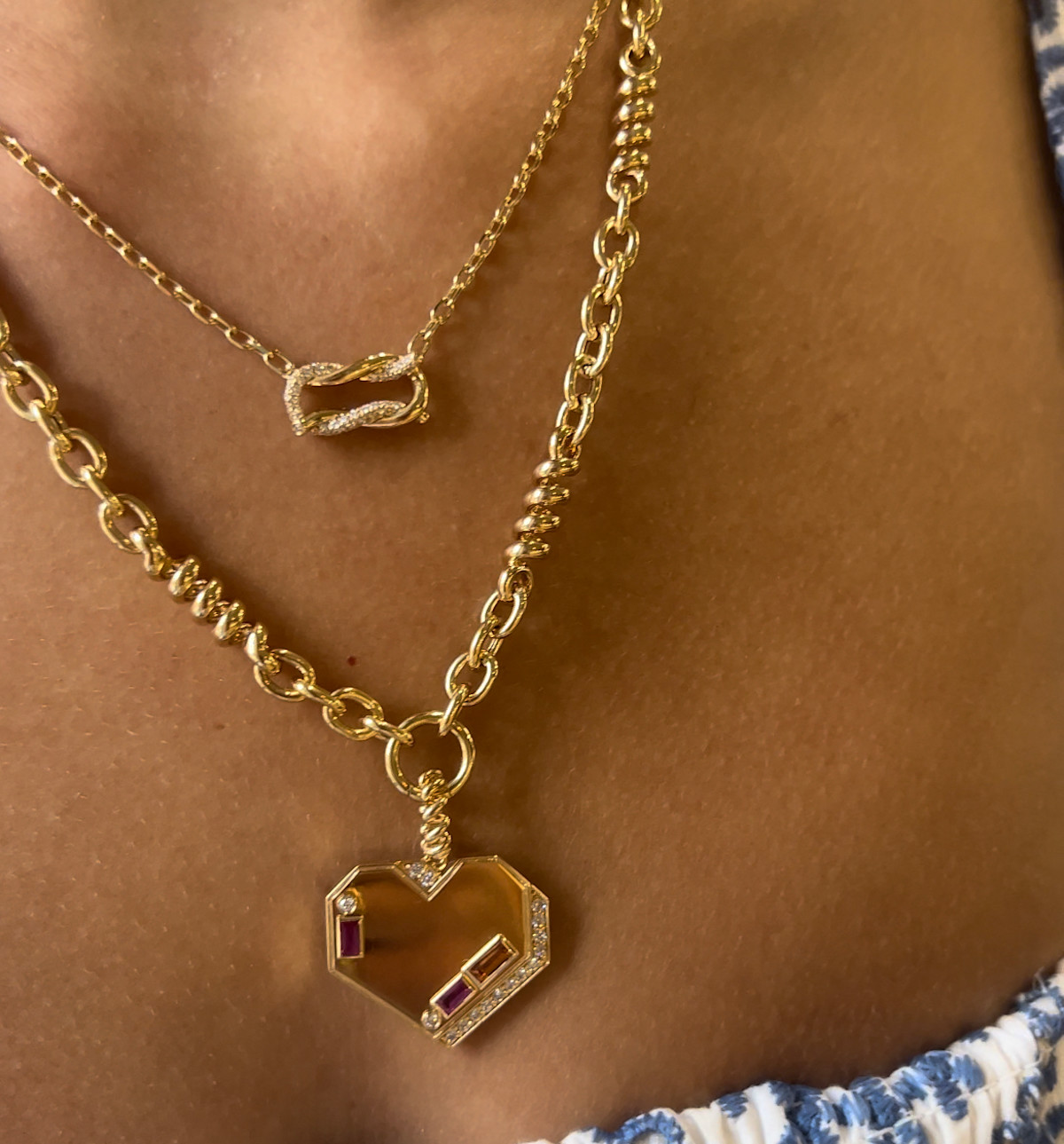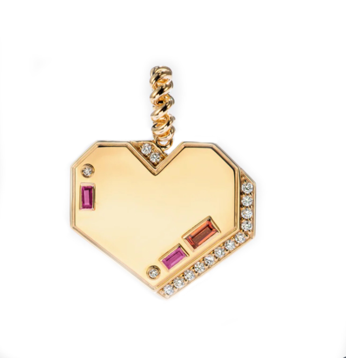 The Jumbo Heart Pendant Featuring Inaly Orange and Pink Sapphires with a Row of Round Diamonds in 18K Yellow Gold.