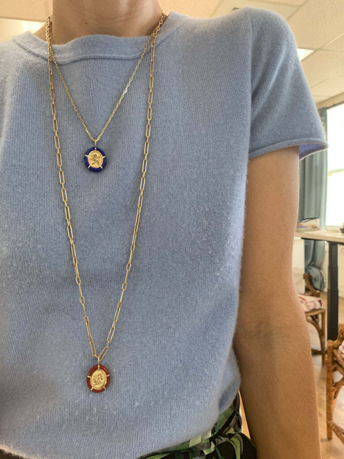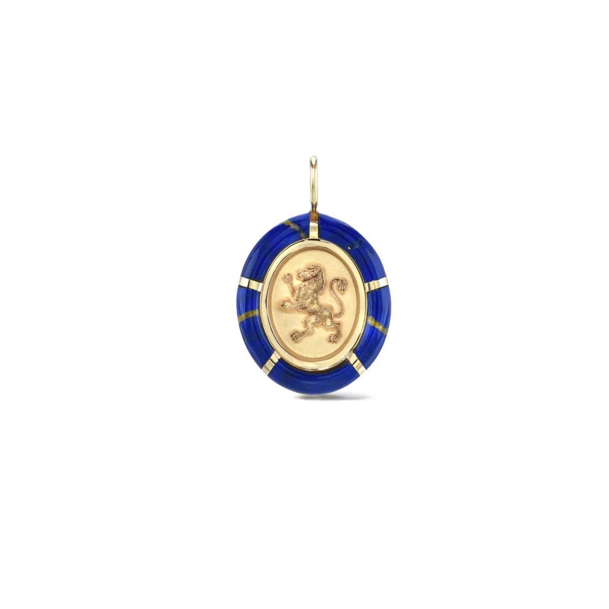 This charm is solid 14k yellow gold and hand cut natural Lapis. The pendant features an oversized bale to fit most chains. Please inquire for dimensions.
