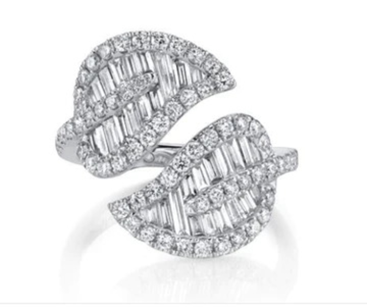 The Large Leaf Diamond Ring by Anita Ko is a showstopping statement ring. The baguette diamonds offer beautiful sparkle and are incredibly luxurious. Wear this on your right hand for a full finger of diamonds!