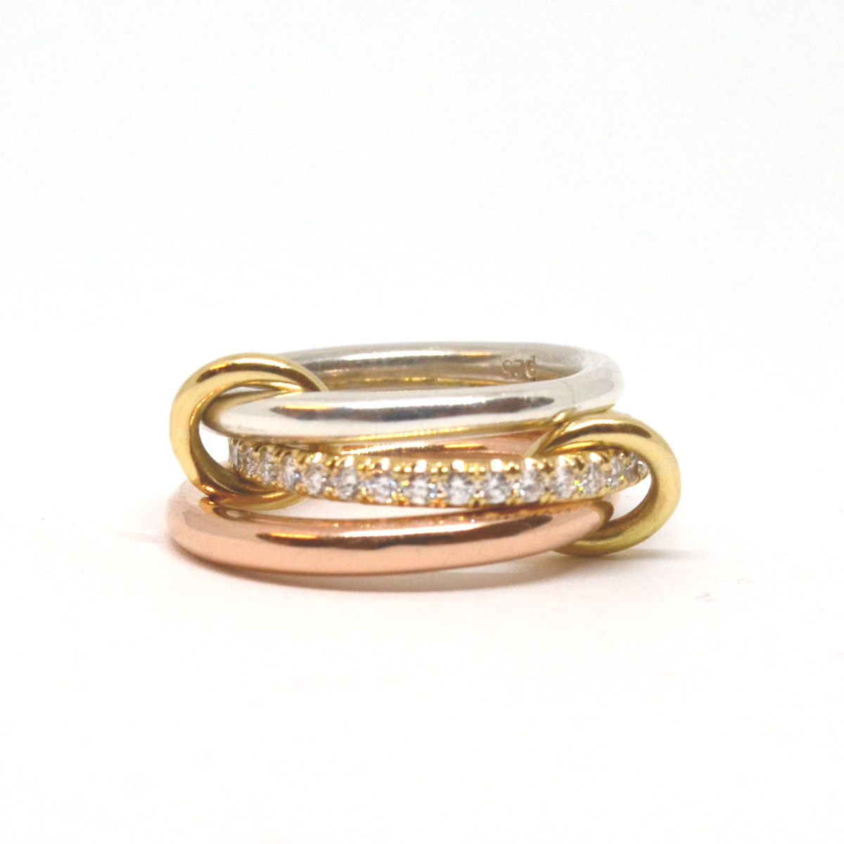 Three linked rings in 18k yellow and rose gold with U-pave white diamonds and yellow gold connectors (approx .7ct).