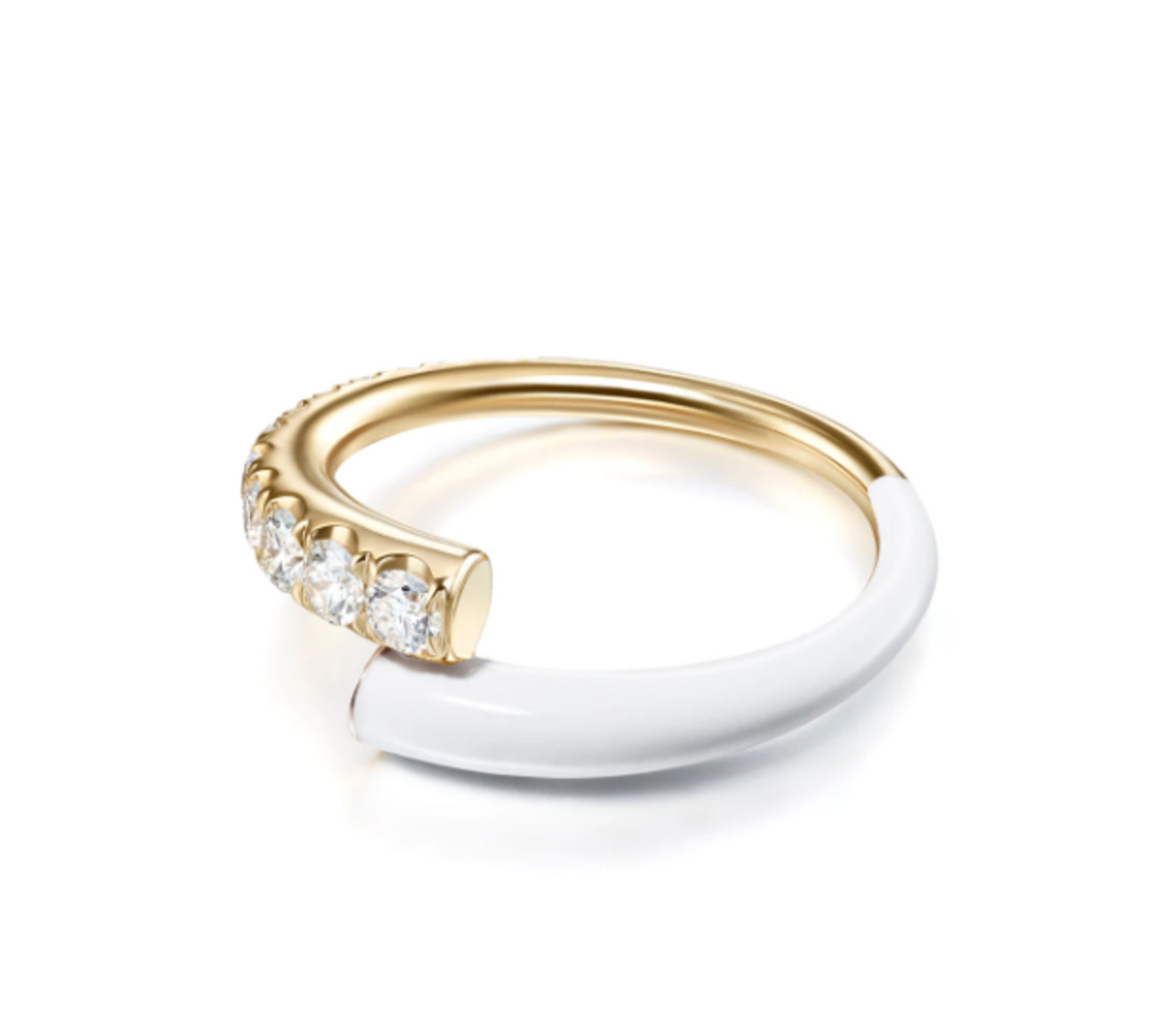 We love this neutral Lola Pinky Ring by Melissa Kaye that features white enamel and diamonds. Wear this stacked with a neon Lola Pinky Ring for a fun, edgy look.