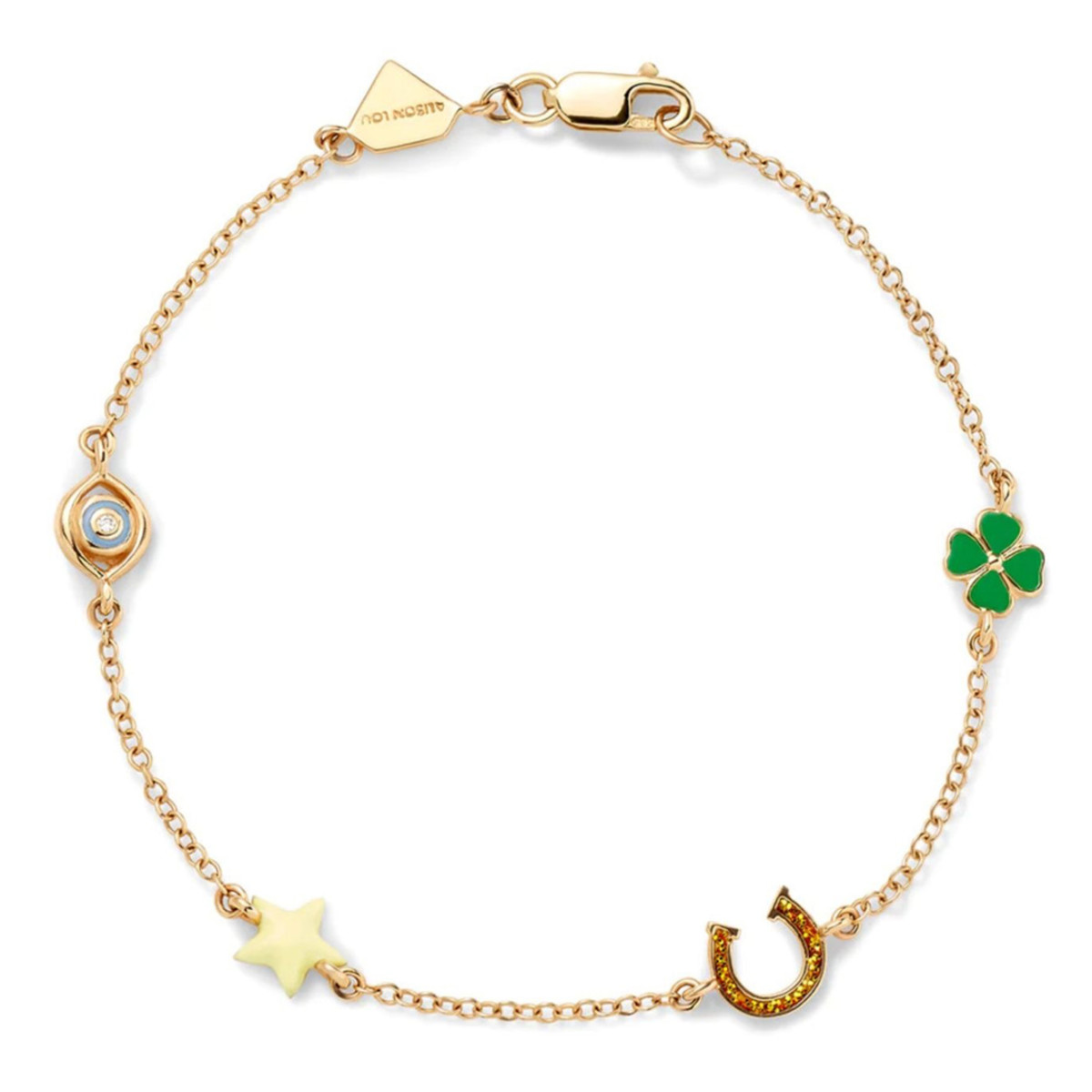 A Little Bit of Luck to Wear Each Day. Features Evil Eye, Star, Horseshoe, and Four Leaf Clover Charms.