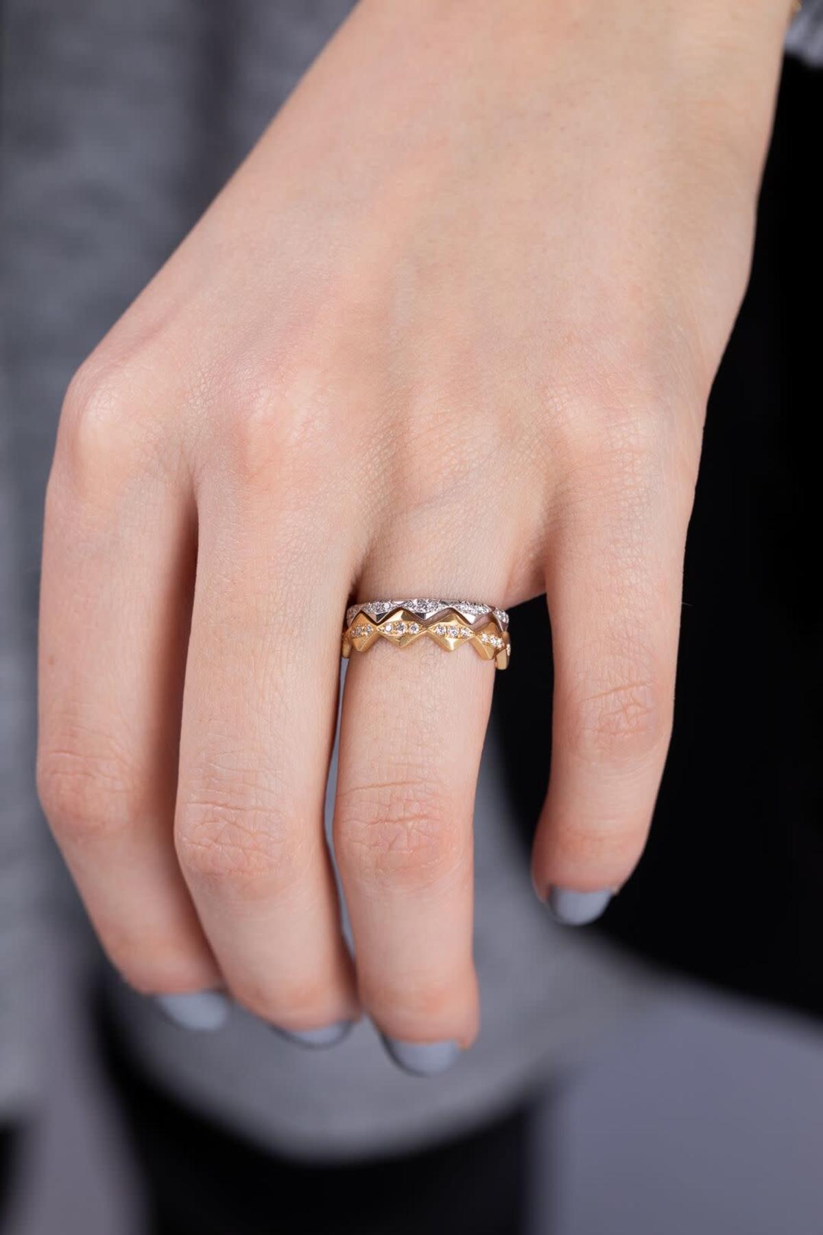The Mabel Band Features a Double Ended Triangular Design With Pave Diamonds. This Band Can Be Used To Break Up a Traditional Ring Stack By Adding Texture and Shape. This Band Looks Especially Good Stacked With The Jade Trau Clara Stacking Band.