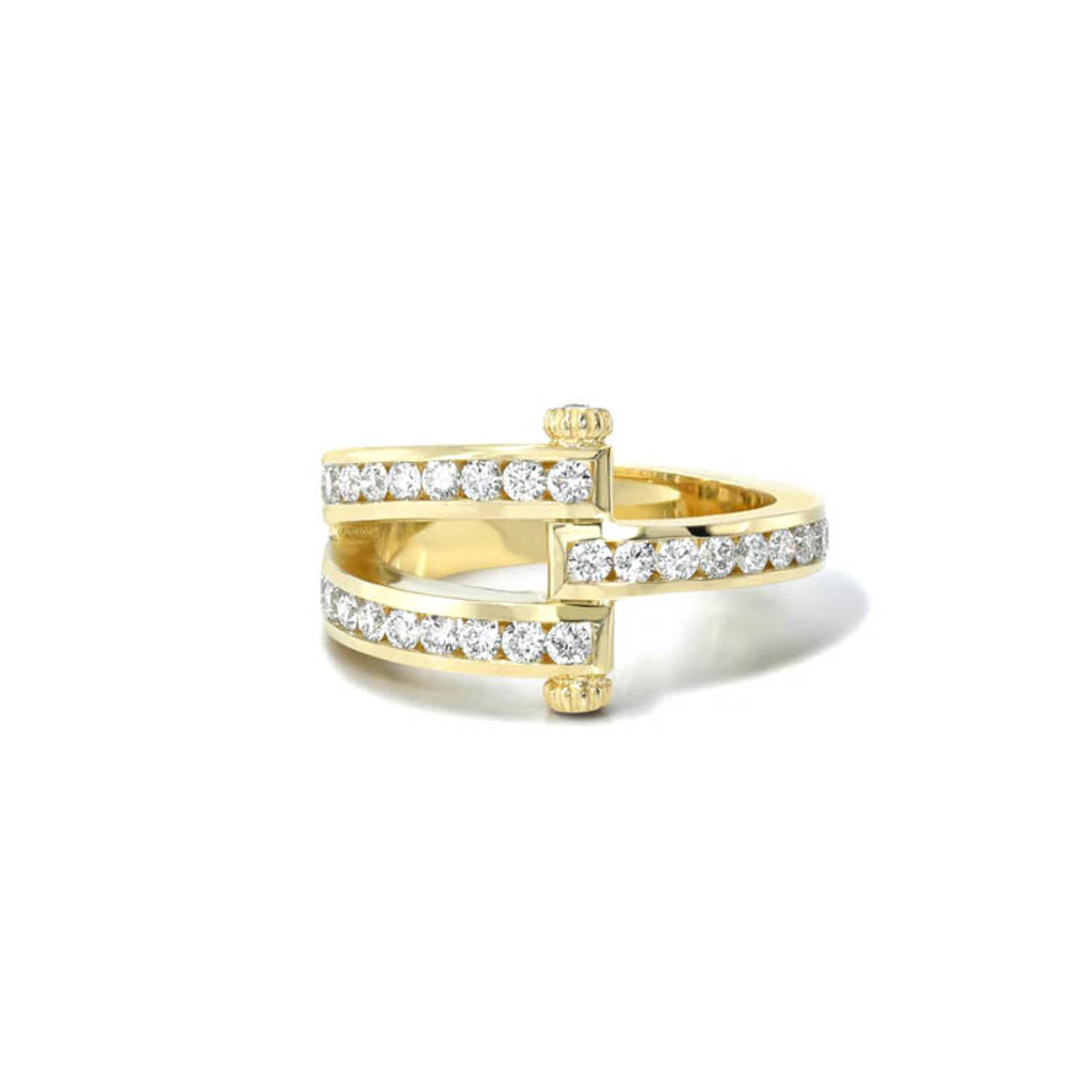 Magna Means ‘Great’ in Latin. Polished 14K Yellow Gold with Channel Set White Round Brilliant Diamonds and Two Bezel Set Round Brilliant Diamonds.