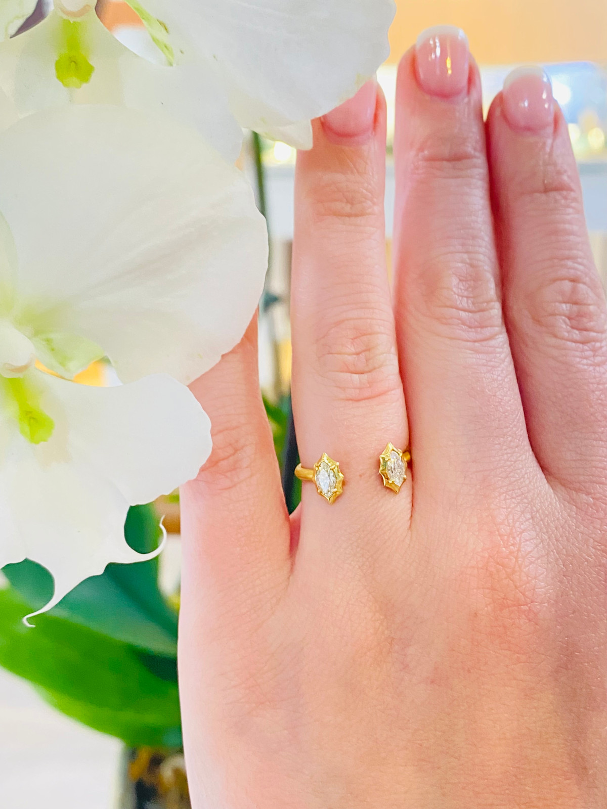 The Maverick Open Ring Features Two Opposing Marquise-Cut Diamonds With a Bypass Between The Two Stones. We Love How This Ring Looks on The Pointer Finger But, Of Course, Looks Great Anywhere On The Hand.