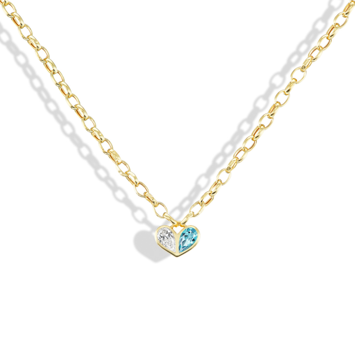 Elevate your style with Gemella’s Medium Heirloom Sweetheart Necklace, featuring a heart-shaped pendant made from sparkling diamonds and soft aquamarine. Set in 18K yellow gold, this elegant pendant hangs on a 16″ adjustable diamond-cut oval heirloom chain, offering both a classic design and modern versatility. Perfect for everyday luxury or special occasions, this aquamarine and diamond heart necklace brings timeless sophistication to any jewelry collection.