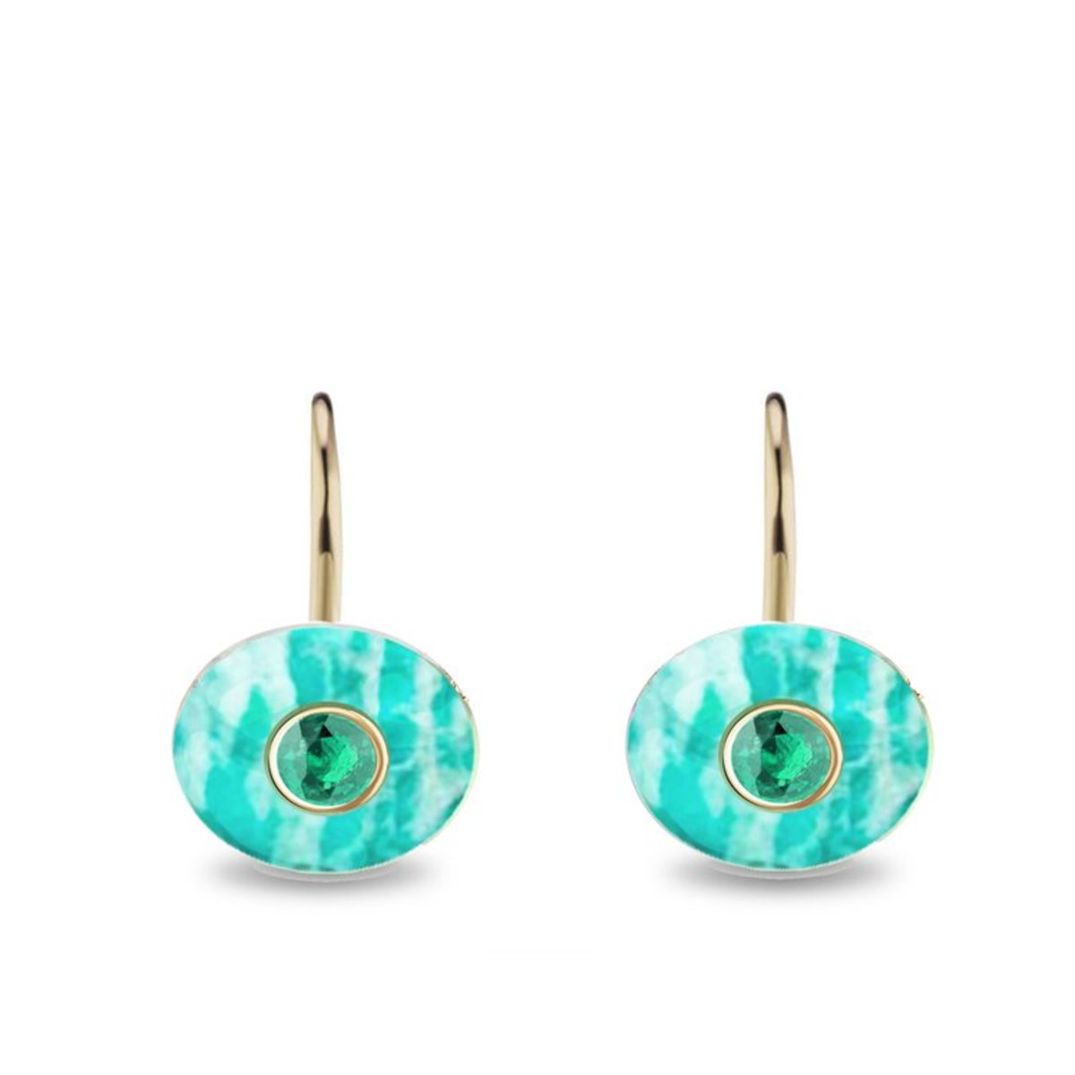 The Milestone Drop Earrings by Mason and Books feature eye catching amazonite drops with a stunning center emerald. We love how airy and light these are!