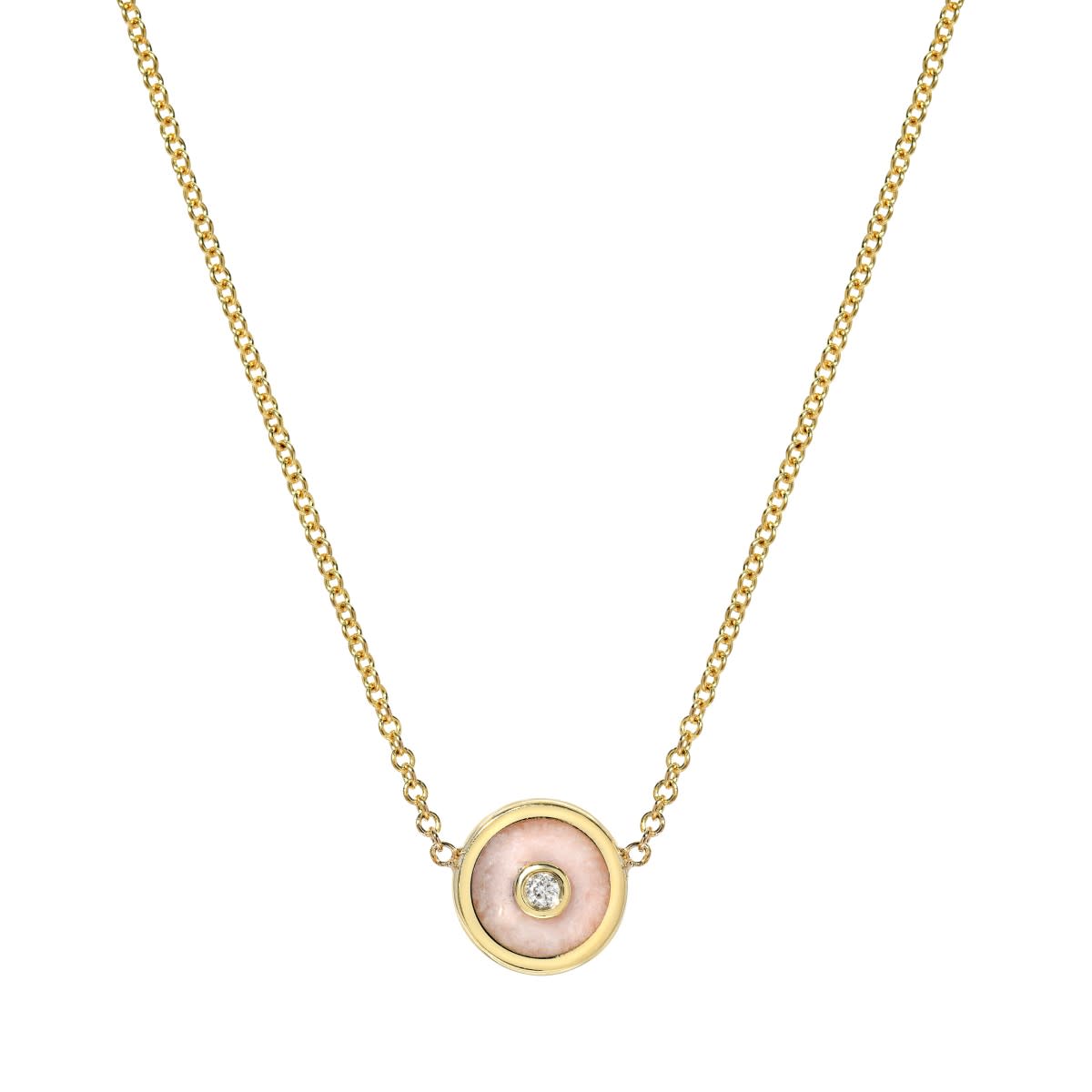 Hand cut Pink Opal inlay set in 14k yellow gold with 0.02ct white diamond.