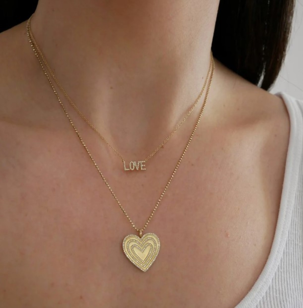 The mini diamond love necklace features 0.07 carats of diamond set in 14k gold.