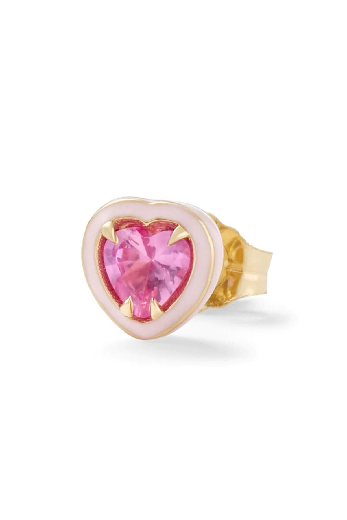 Add subtle sparkle and a touch of color to your ear with a heart shaped pink sapphire and a pink enamel border stud in 14k yellow gold.