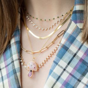 The Mini Picnic Charm Necklace by Brent Neale features hand carved stone charms on a wheat chain. Wear this beautiful French picnic!