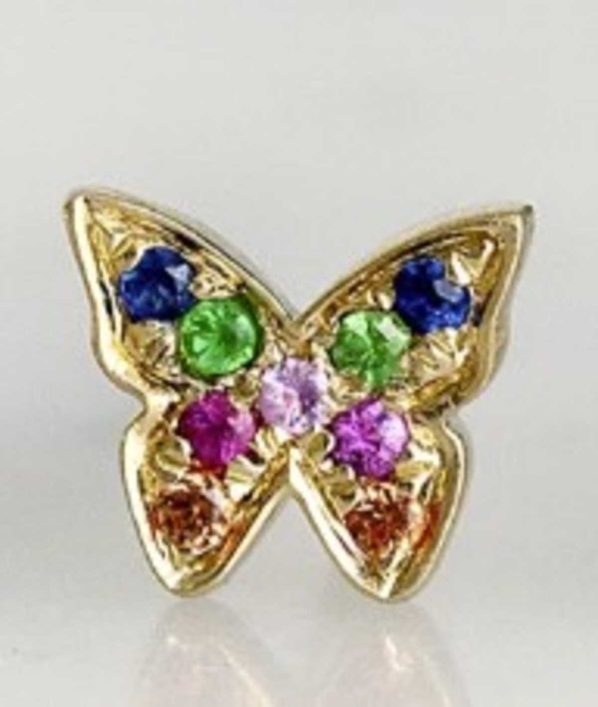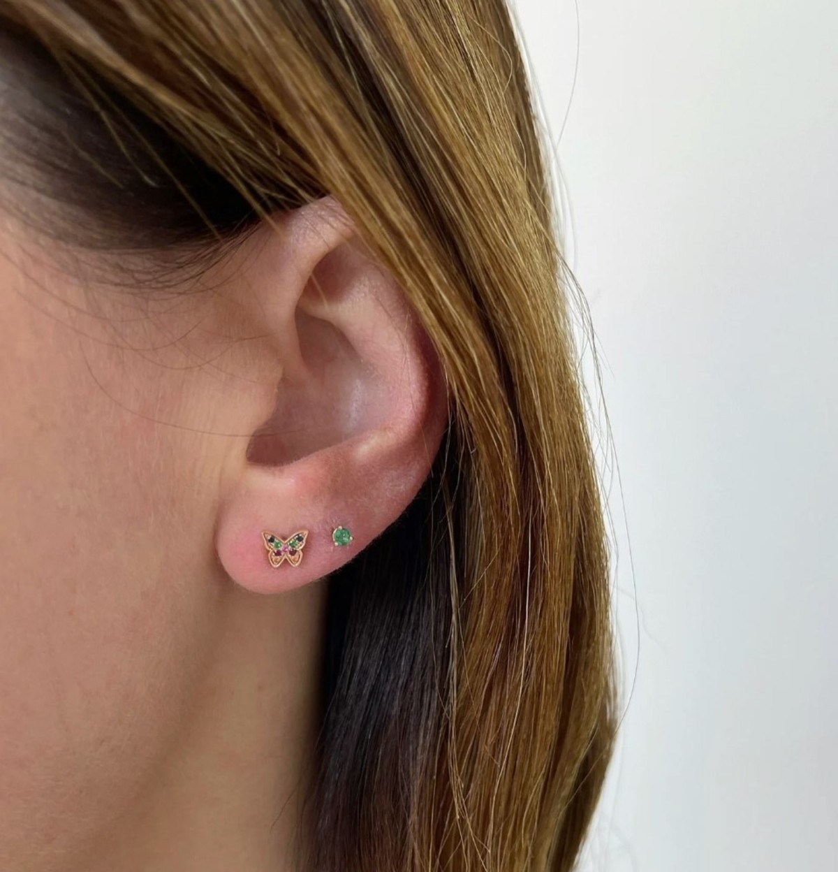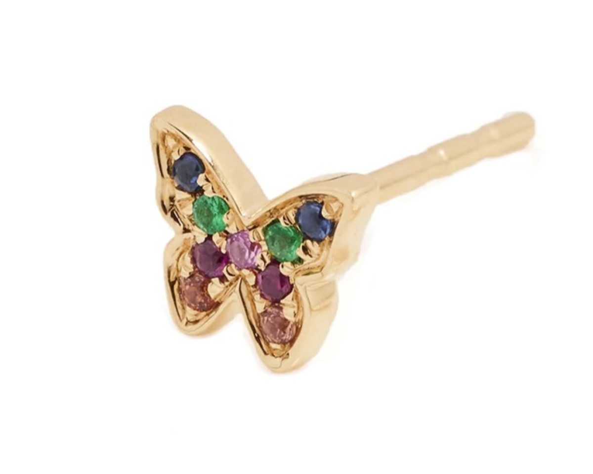 The EF Collection Mini Rainbow Butterfly Stud Earring features rubies, emeralds, and multiple colors of sapphires.