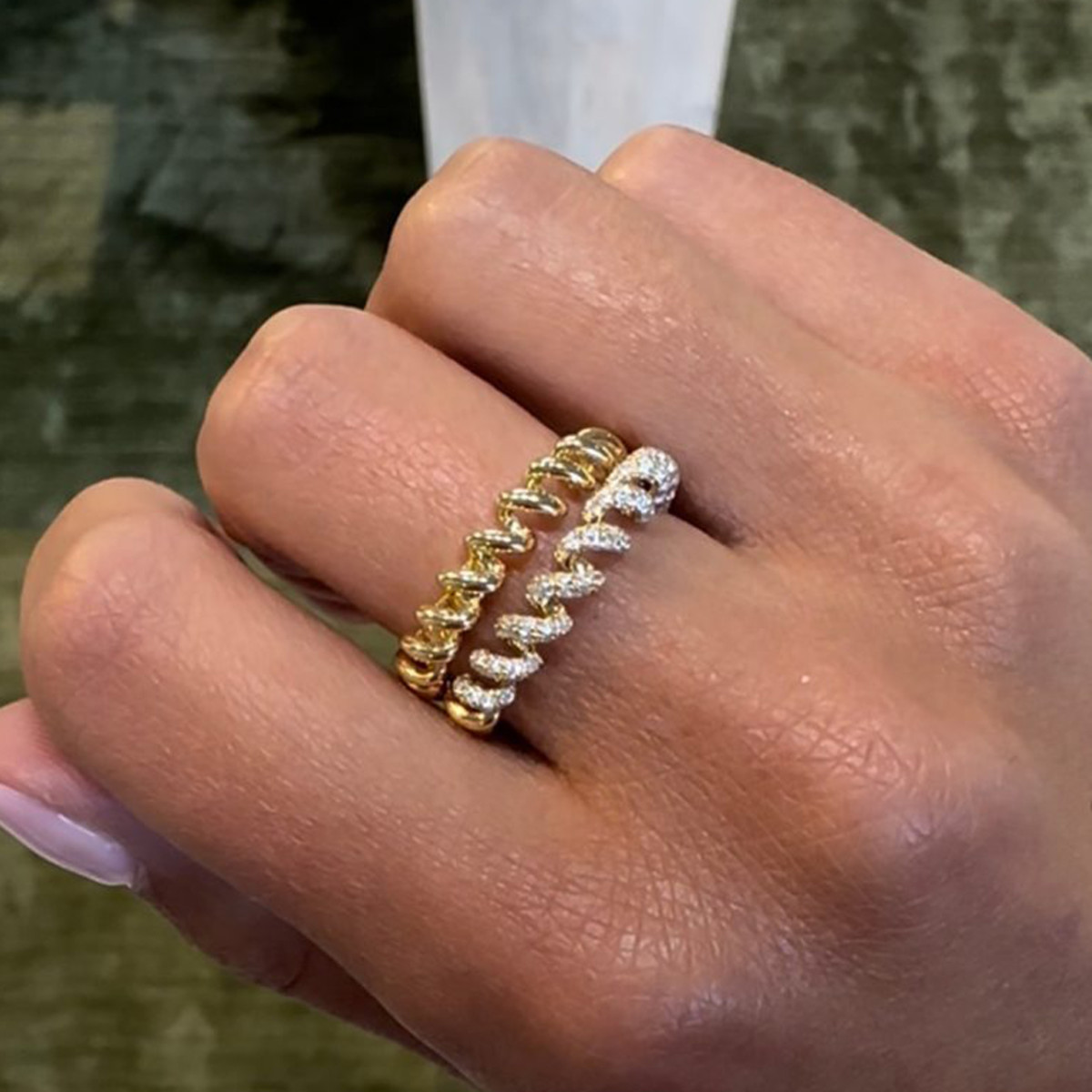 The Mini Slinkee Ring by Boochier features their signature coiled slinkee silhouette. This looks beautiful stacked with the Boochier Mini Diamond Slinkee Ring.