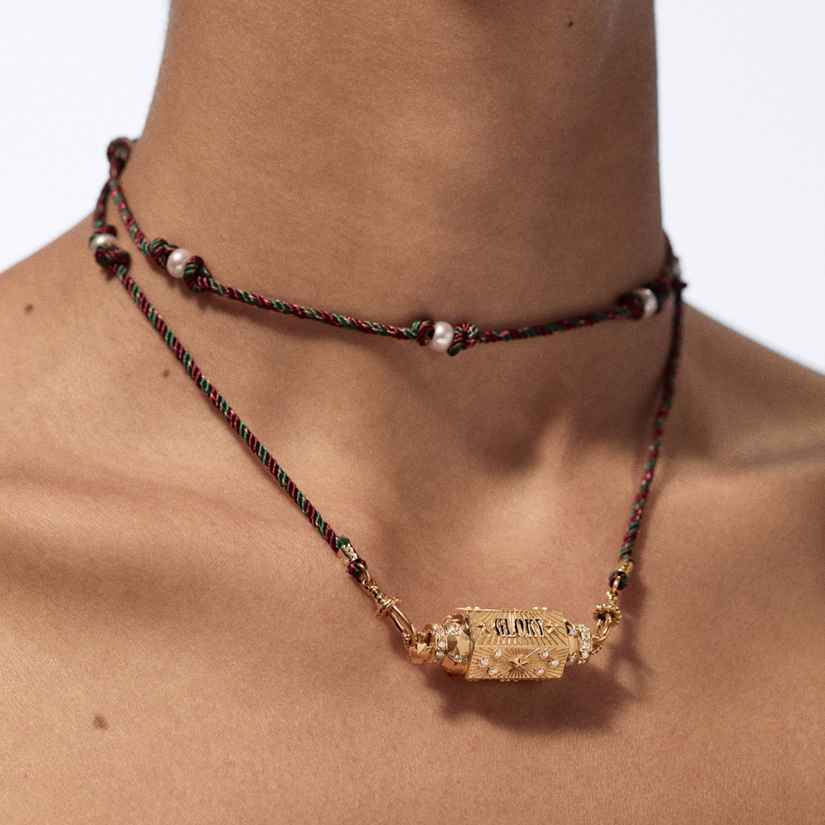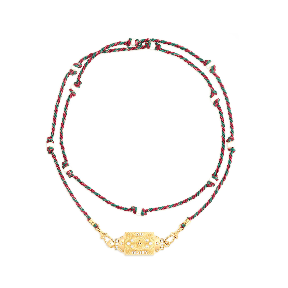 This striking yellow gold locket from Marie Lichtenberg is a symbol of fearless spirit and adventure. Adorned with shimmering white diamonds, the piece features the bold inscription, “NO RISK NO GLORY.” The locket hangs on a 73cm Silky Mauli link, designed to be worn as a long chain or doubled for a layered look. Perfect for those who believe that great rewards come from daring choices.