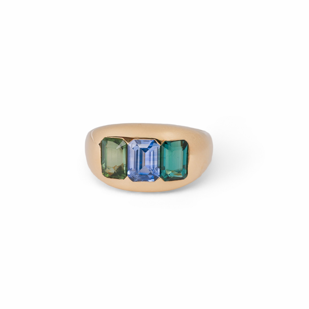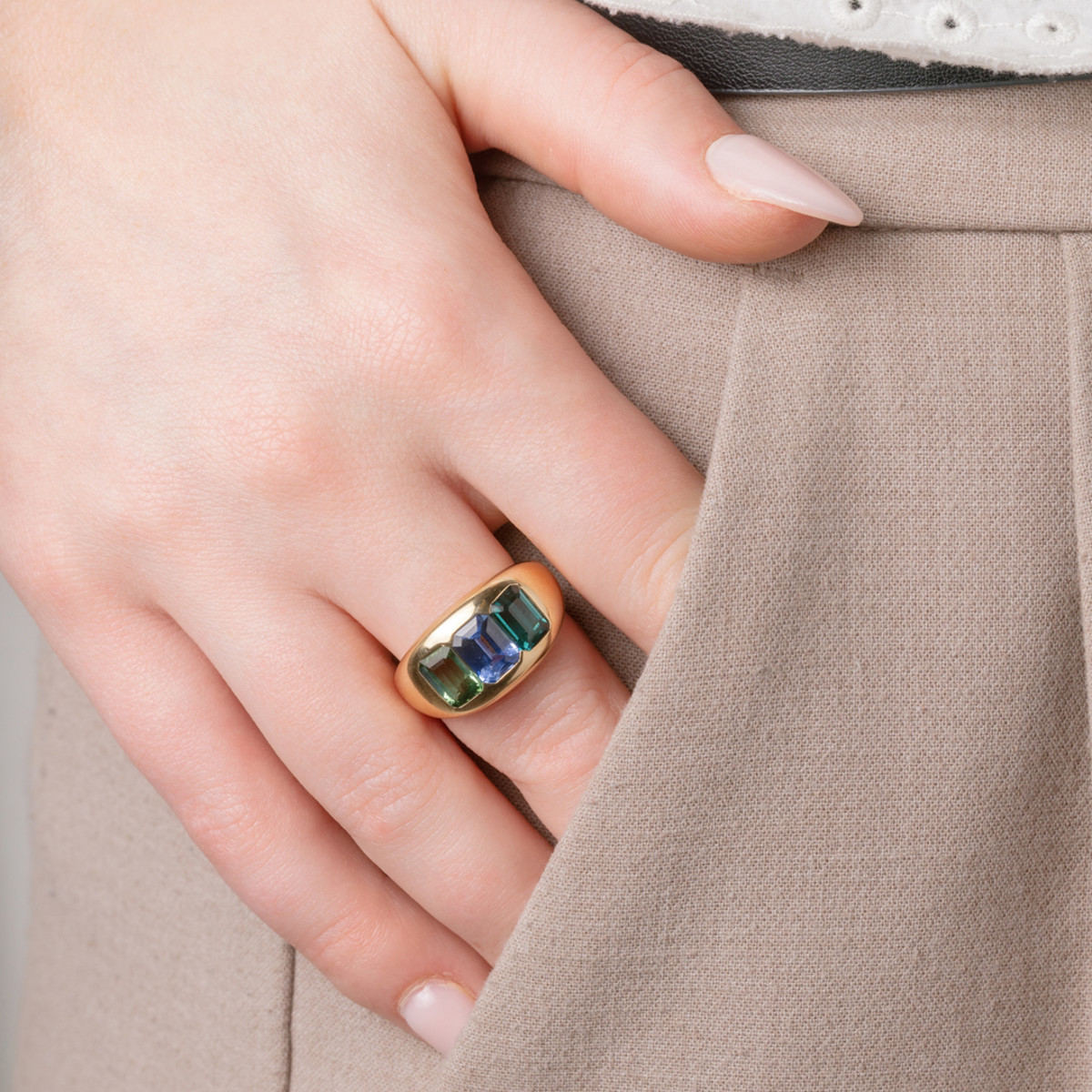 Make a bold, one-of-a-kind statement with this OOAK (One of a Kind) Three Emerald-Cut Ring, showcasing a stunning trio of gemstones: a vivid blue sapphire, a rich green tourmaline, and a captivating teal centerpiece, all elegantly set in luxurious 18K yellow gold. Each emerald-cut stone is hand-selected for its brilliance and unique character, creating a timeless and modern design that’s truly unforgettable. Perfect as an alternative engagement ring or a collector’s piece for gemstone lovers.