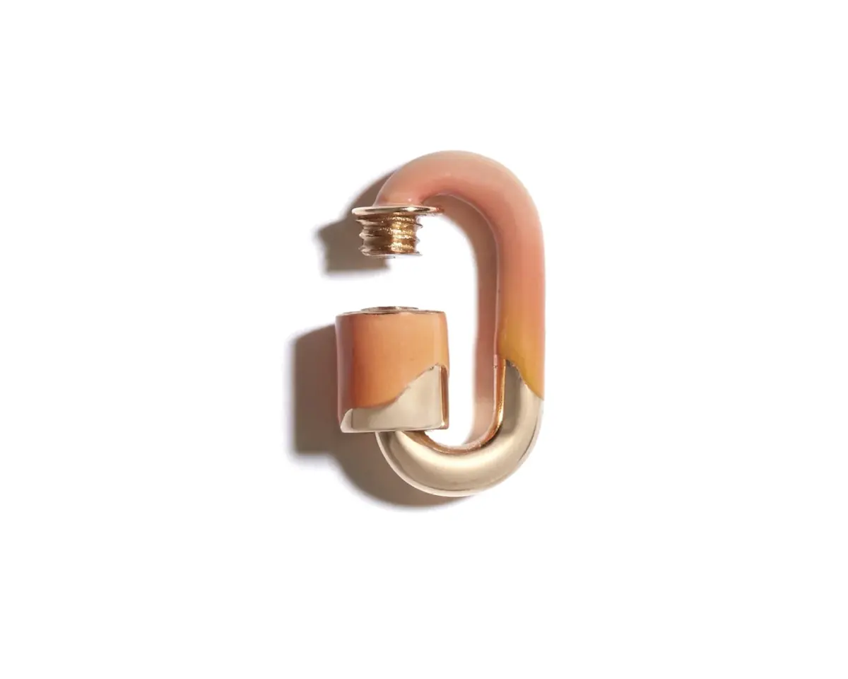 Add a touch of playful elegance to your jewelry collection with the Pêche Enamel Chubby Babylock in 14K Yellow Gold from M. Flynn. Crafted in solid 14K yellow gold and finished with a soft peach enamel coating, this stylish babylock is the perfect connector for charms, chains, or to wear on its own. A modern twist on a timeless design, it adds a subtle pop of color and versatility to any necklace or bracelet stack. Ideal for layering and mixing with other locks or links, this piece is a must-have for jewelry lovers looking to personalize their look.