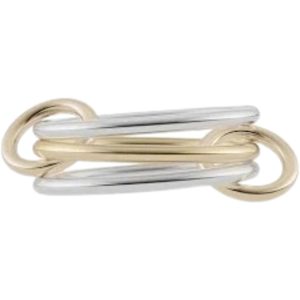 3 linked rings in sterling silver and u-pave grey diamonds with yellow gold connectors. Size 7 is typically in stock, text us to special order and with questions, 617-292-0079.