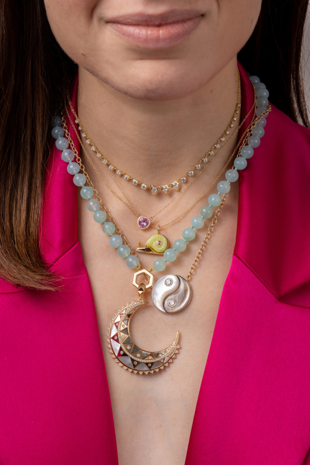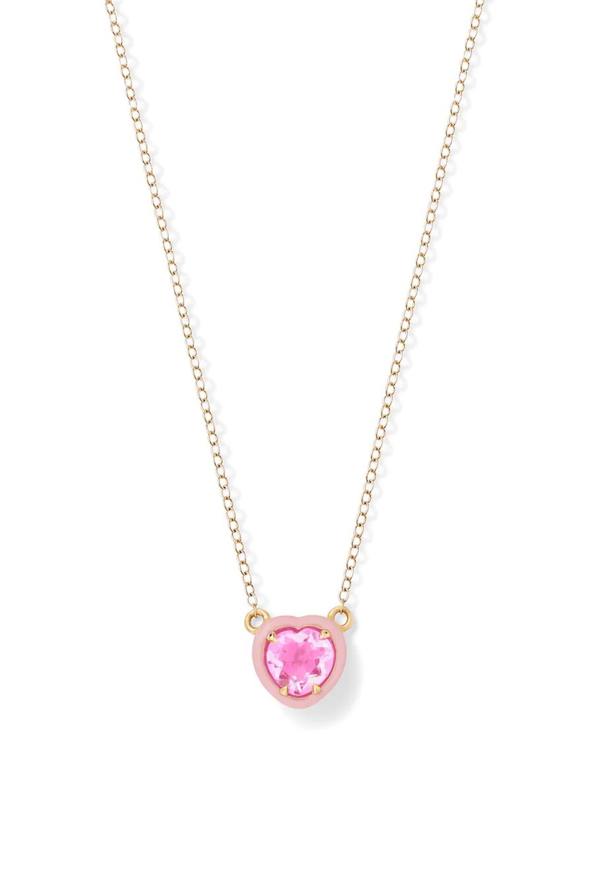 Add a pop of color to your neck with this pink sapphire heart necklace featuring a pink enamel border in 14k yellow gold.