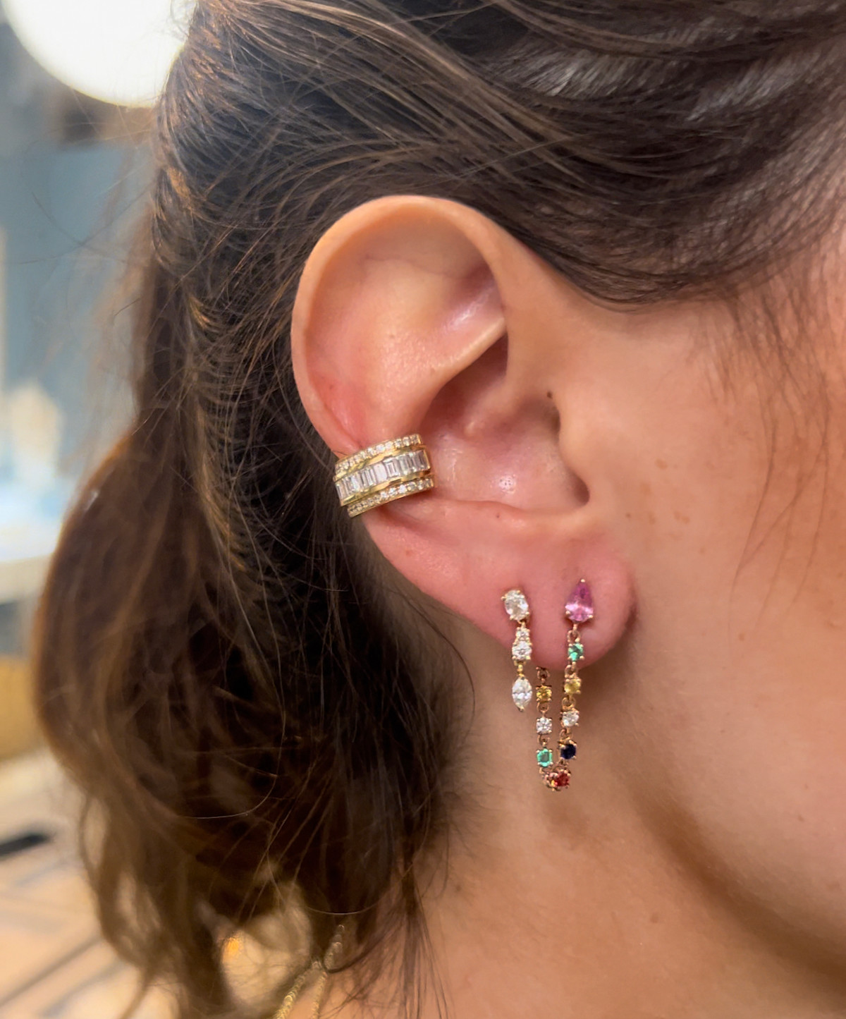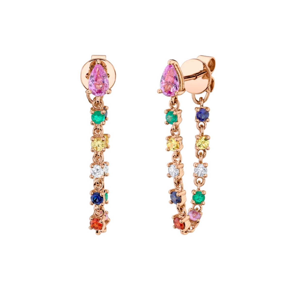 18K Yellow Gold Pear Shaped Pink Sapphire, Diamond and Multi-Colored Fine Gemstone Loop Earrings