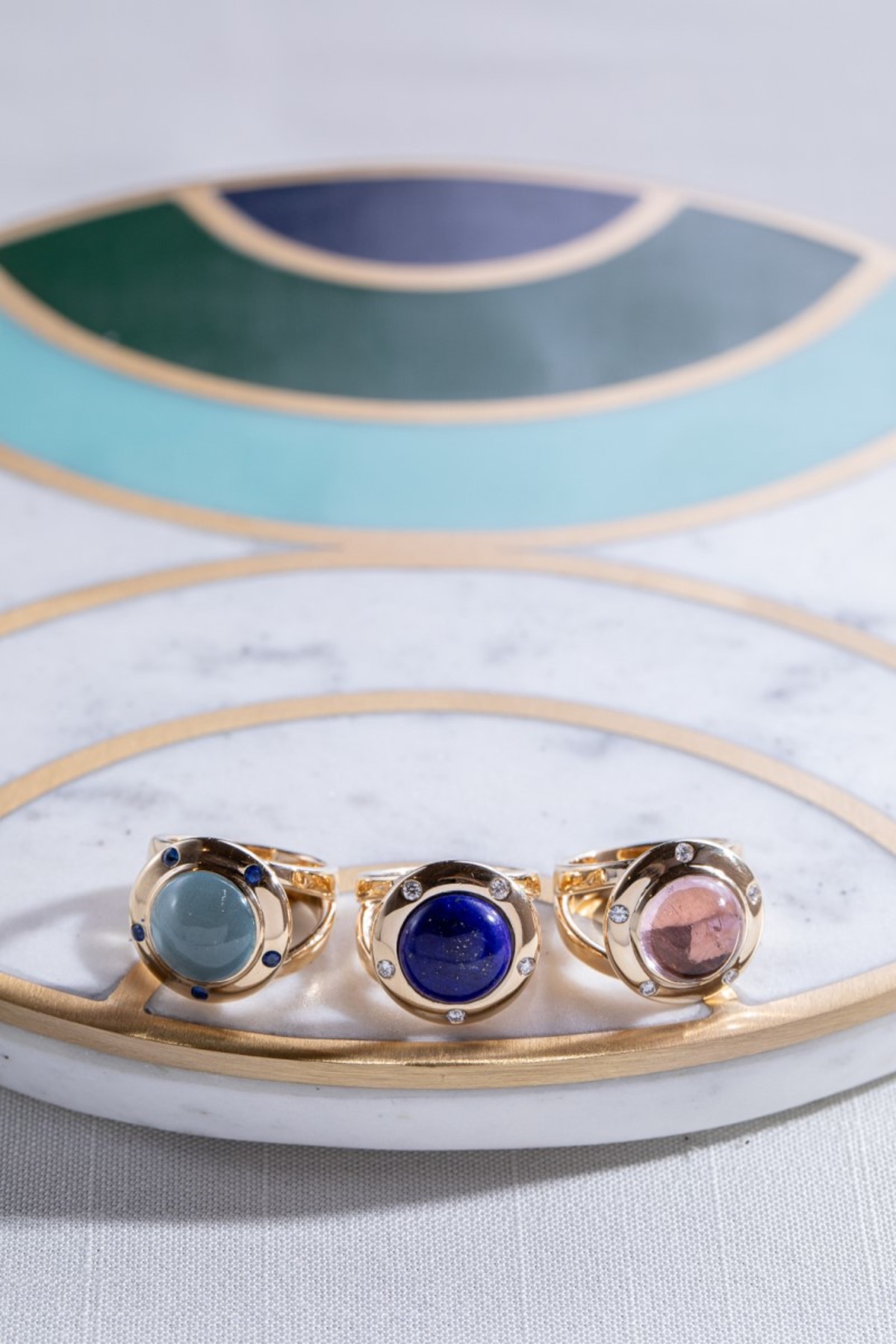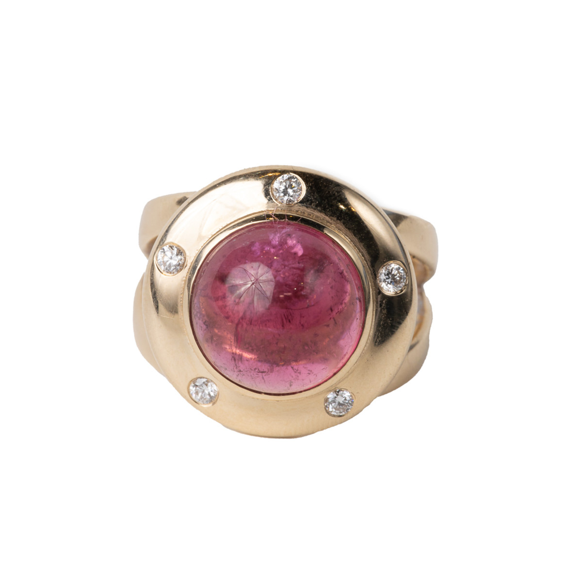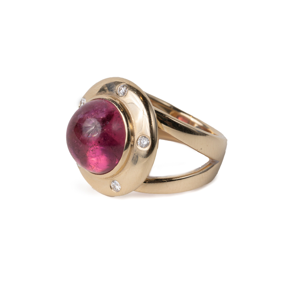 14K yellow gold ring with a pink tourmaline cabochon surrounded by 5 diamonds. We love how bold and comfortable this ring is.