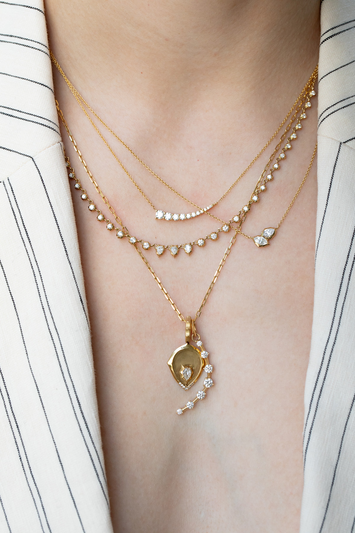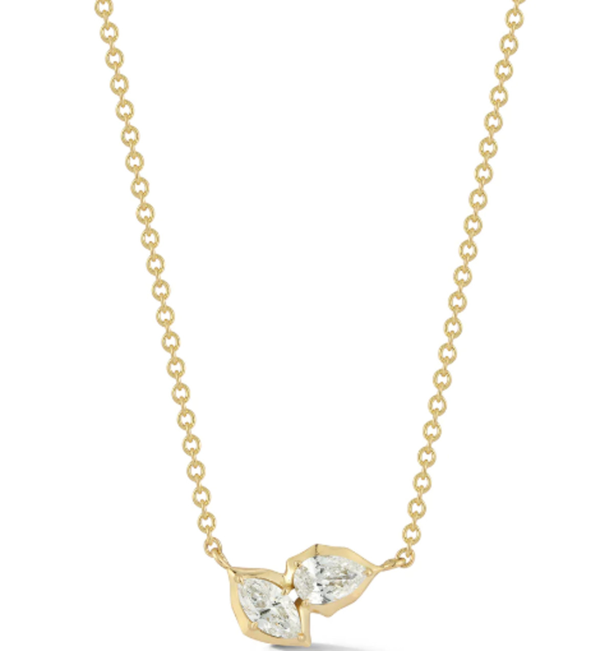 The Poppy Two-Stone Necklace Features a Marquise and Pear Diamond Duo Pendant in 18K Yellow Gold