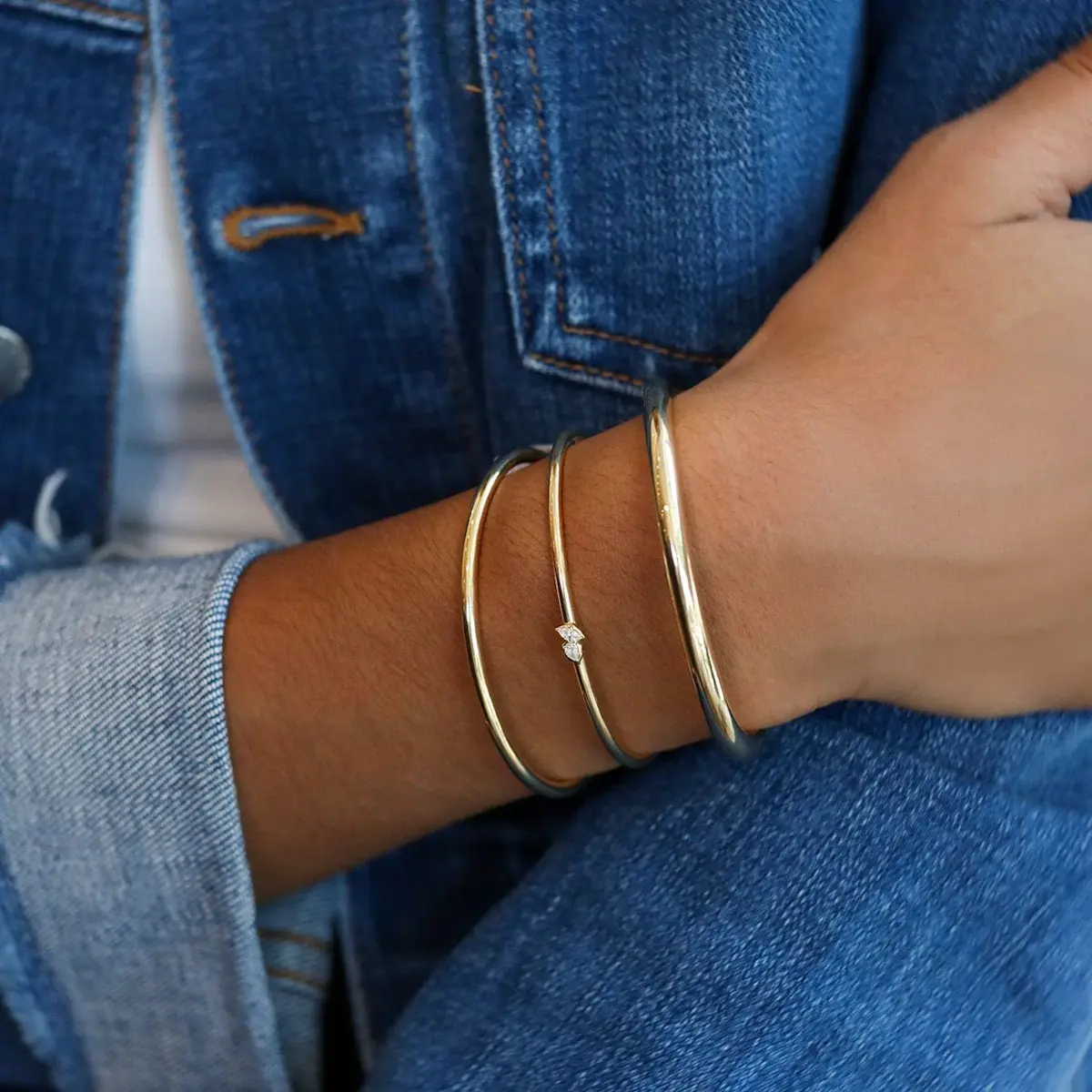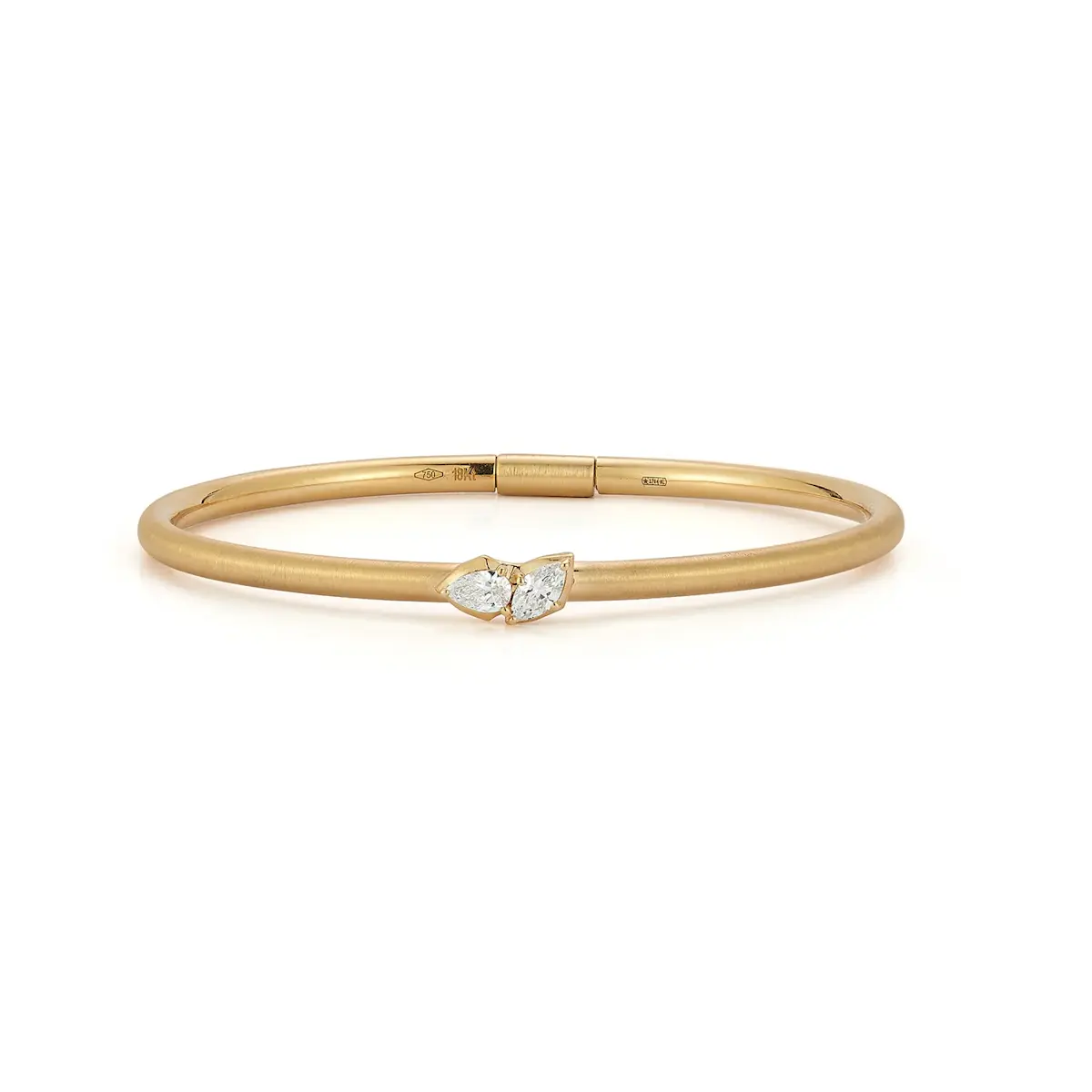 Graceful and sculptural, the Poppy Two Stone Plié Bangle blends fluid form with a hint of sparkle. Handcrafted in 18K yellow gold, this open bangle features two bezel-set stones that appear to dance at the wrist—an elegant balance of movement and minimalism. A timeless piece designed for stacking or wearing solo as a statement of quiet luxury.