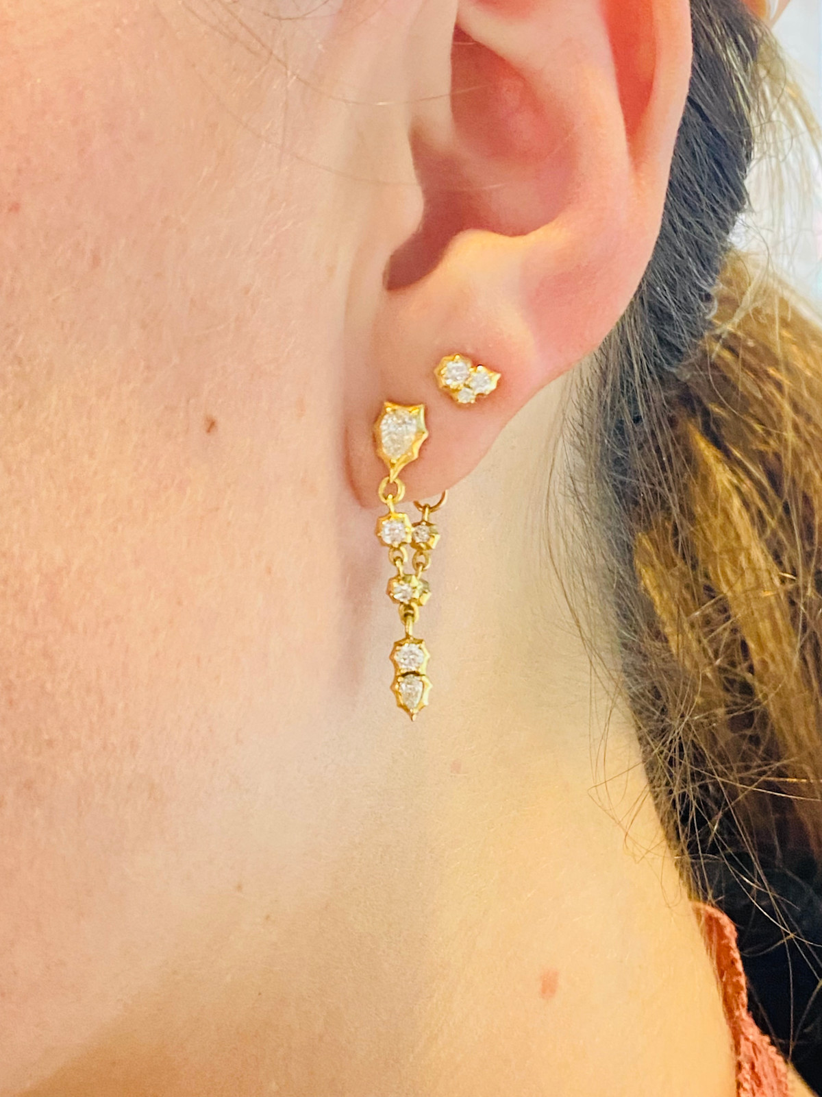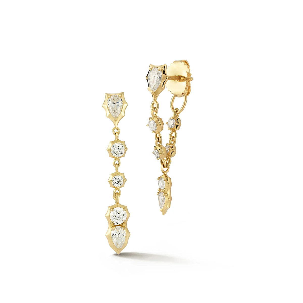 The Posey Loop Earrings feature a pear shaped diamond stud with round diamond loops that connect to a dangling diamond cluster