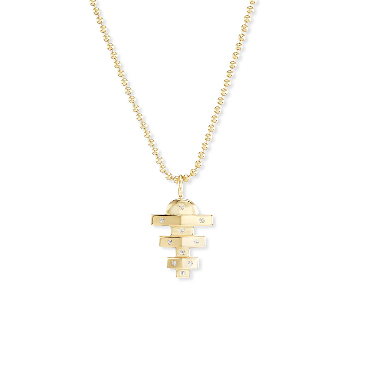The Small Hopscotch Pendant by Brent Neale is an ode to youth and play. Featuring a hopscotch silhouette with scattered round diamonds on a ball chain. We love the unique design combined with the classic gold.