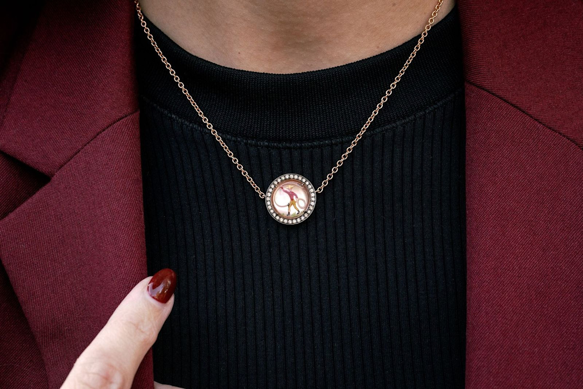 Elevated elegance meets subtle warmth in this exquisite necklace, where the soft glow of champagne-toned diamonds is set against luminous gold. A perfectly round pendant, meticulously bezel-set, frames each diamond to maximize its light and movement — offering a radiance that’s both refined and unforgettable.
