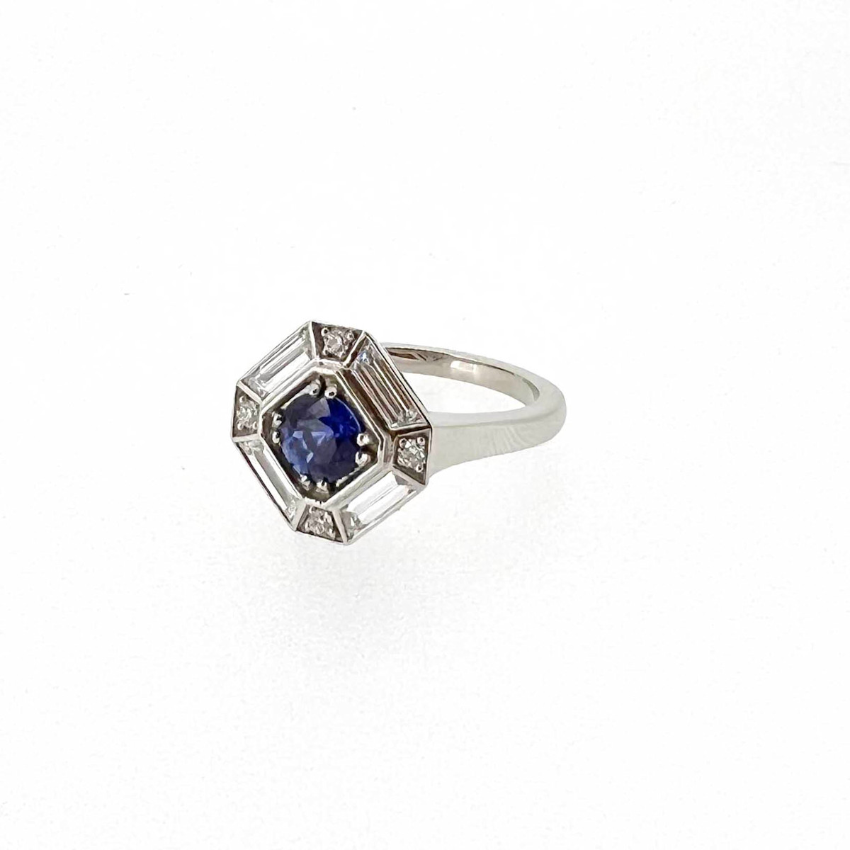 A Classy, Deco Ring with a Sapphire Center Stone with Round and Baguette Diamonds in Platinum.