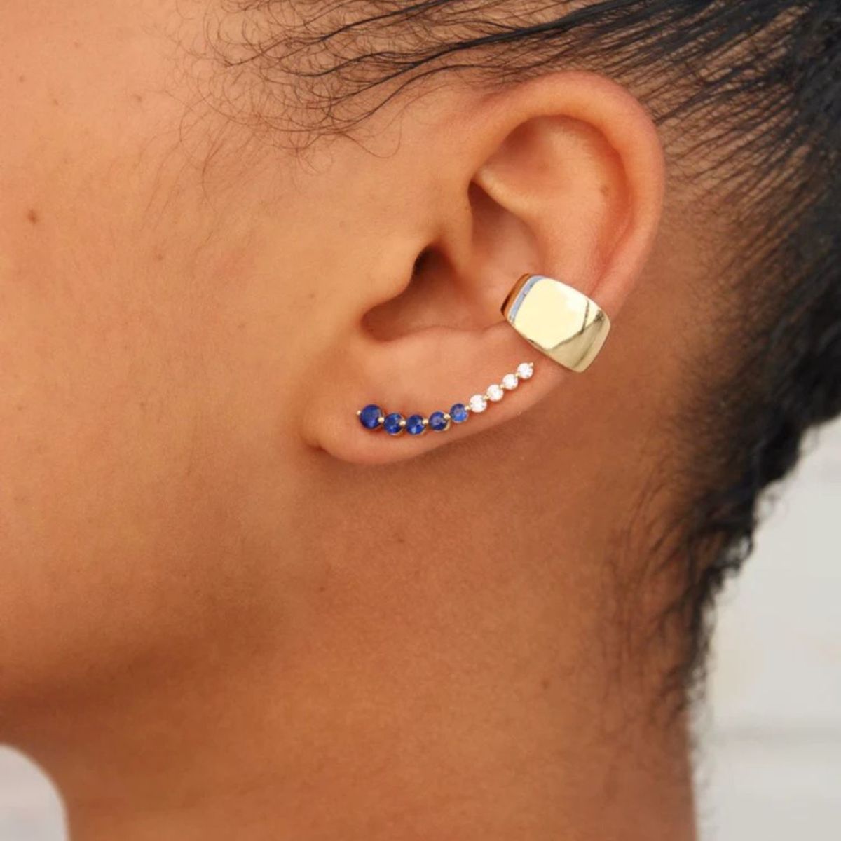 This diamond and blue sapphire climber earring by Anita Ko floats up the ear seamlessly and adorns the ear with diamonds and blue sapphires for an eye catching and bold look.