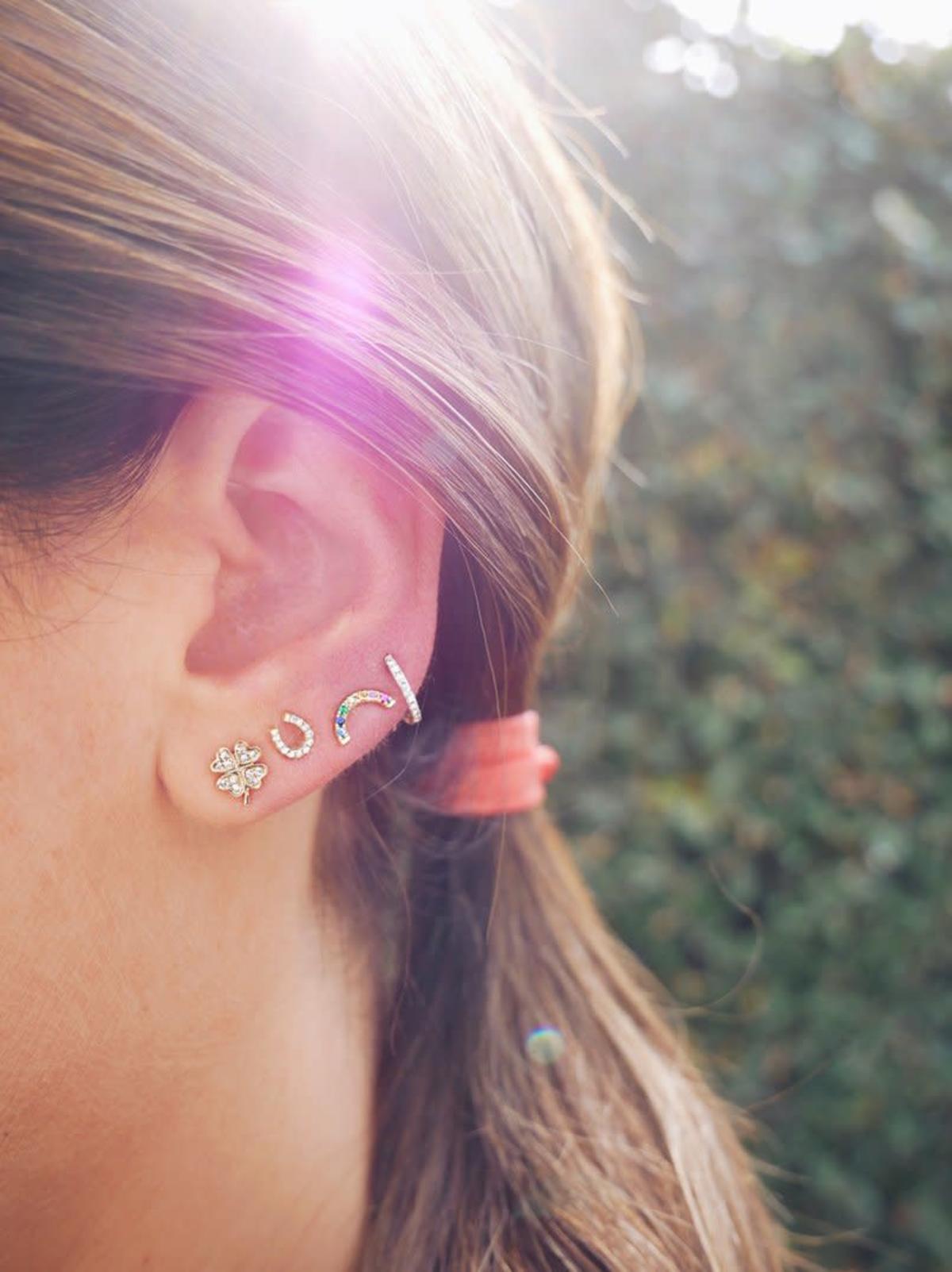 This mini horseshoe stud by EF Collection is covered in white diamonds for a subtle, dainty sparkle effect. Wear these in your second piercing alongside your favorite gold hoops for the perfect everyday gold look!
