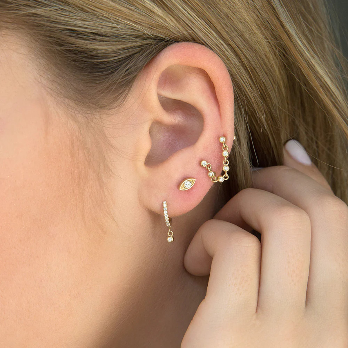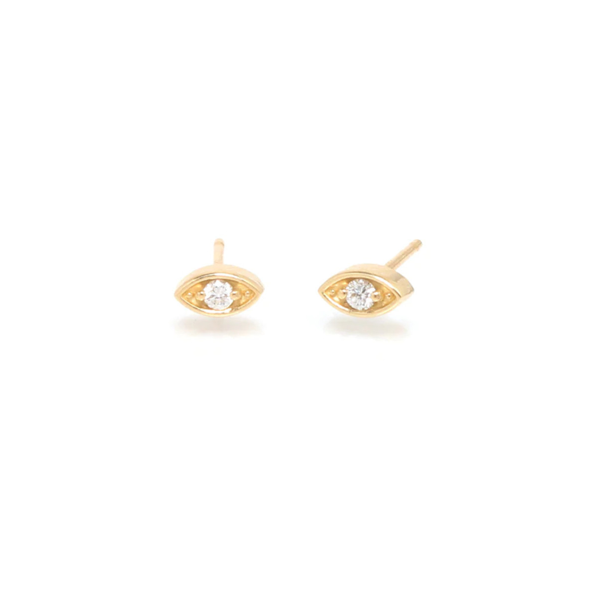 Small Eye Shaped Stud Earrings with Round White Diamonds in The Center in 14K Yellow Gold.