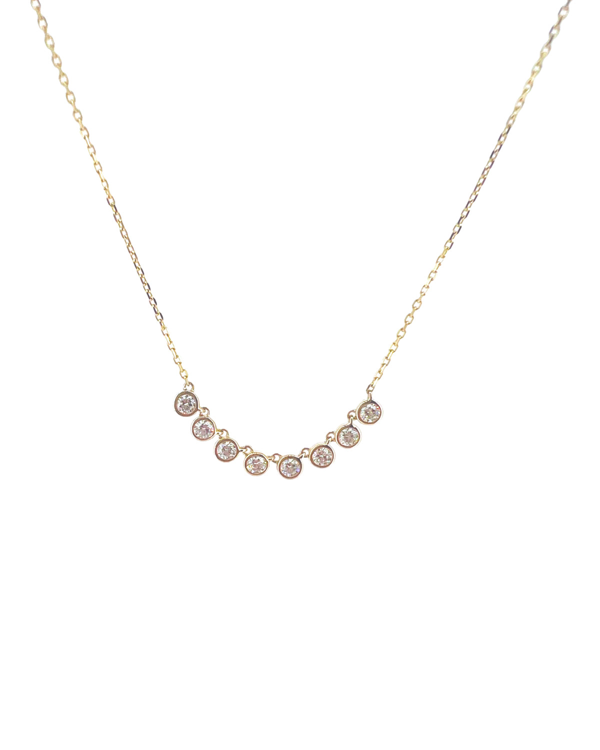 Elegant and effortlessly refined, the Small Gates Riviera Necklace is a timeless expression of modern luxury. Featuring a delicate line of bezel-set diamonds, this necklace delivers continuous sparkle with a clean, streamlined silhouette. Each diamond is thoughtfully set to maximize brilliance while maintaining a smooth, comfortable fit along the neckline.