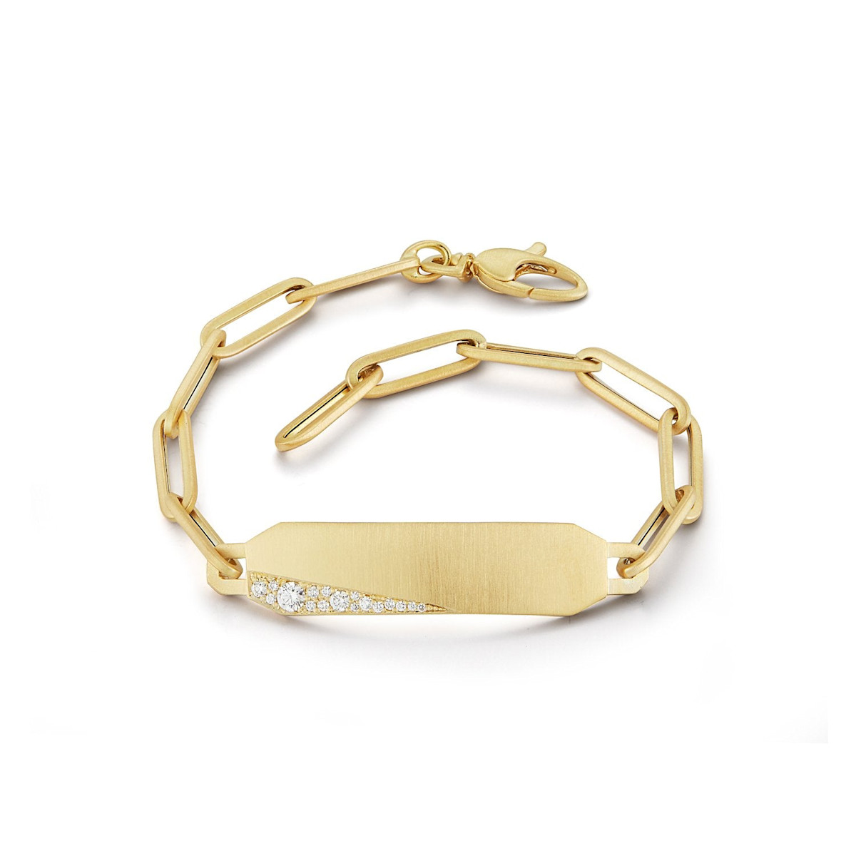 The Small ID Bracelet Features an Engravable Nameplate With a Slice of Mixed Sized Pave White Diamonds On a Solid Gold Chain.