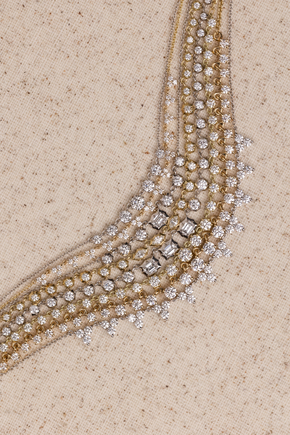 This tennis-style eternity necklace is the perfect hint of classic while firmly rooted in the present. The Small Maverick Riviera Necklace combines the classic tennis silhouette with Jade Trau’s signature Alchemy setting to bring forward a modern feel. Handcrafted in 18-karat gold and featuring 3 marquise-shaped and 32 round, brilliant cut diamonds, the Small Maverick Riviera Necklace is a show-stopping must-have for any jewelry collection.