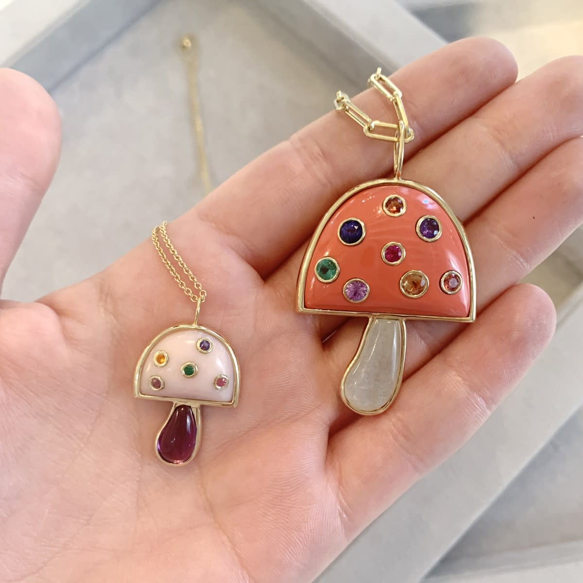 The small mushroom features hand-cut pink opal and amethyst with Multicolored Sapphires