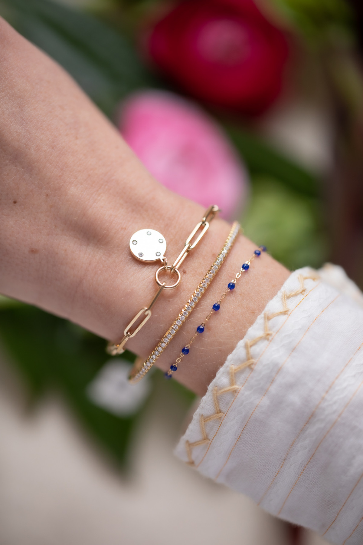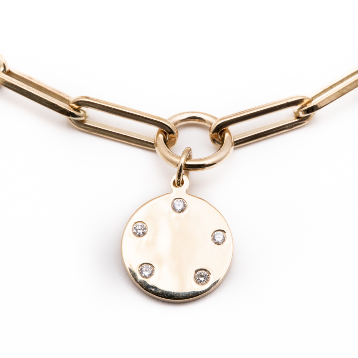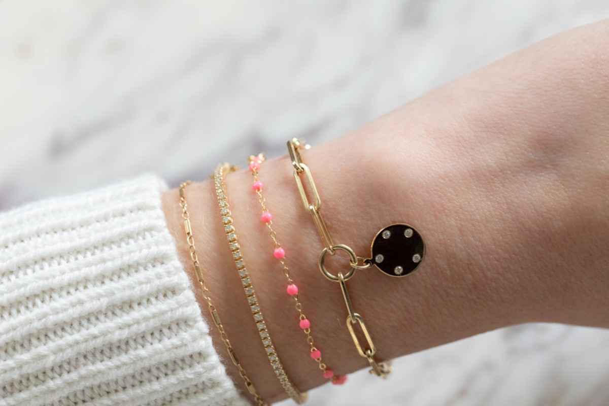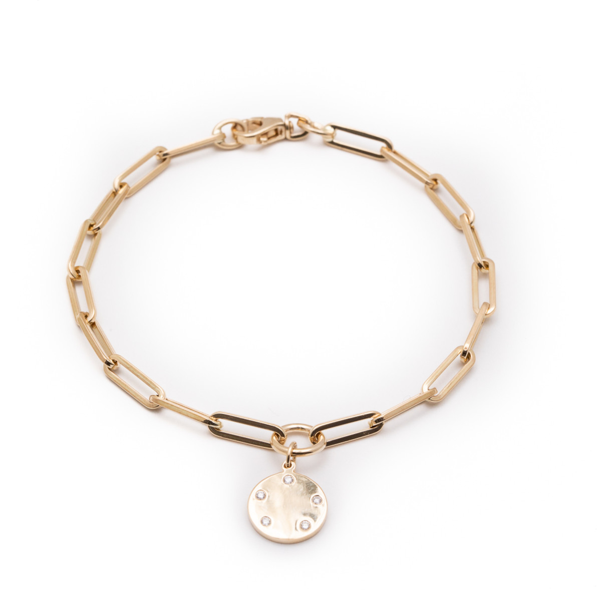 A part of The GATES Collection by M. Flynn, this modern charm bracelet comes with a gold disc surrounded by diamonds that can be engraved.