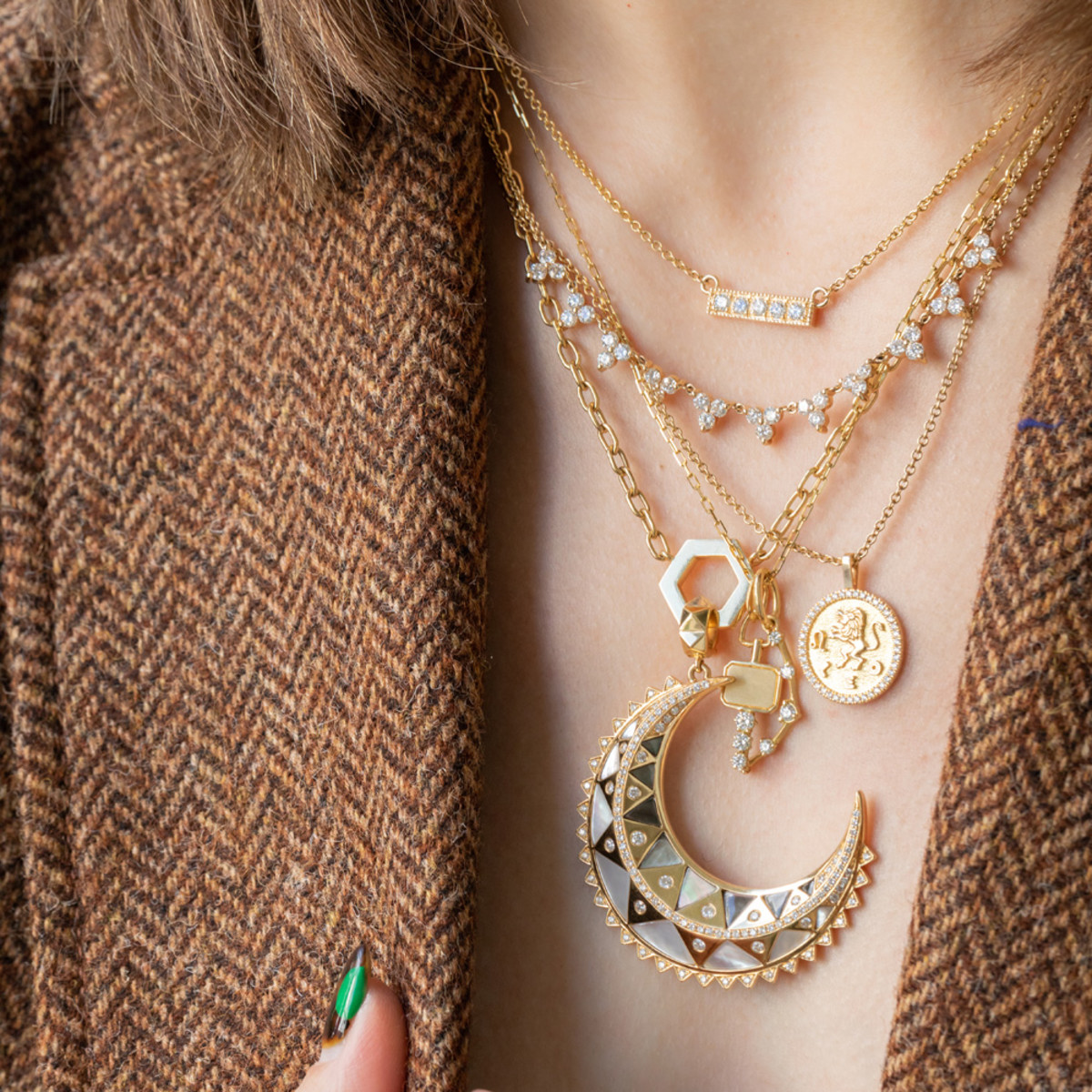 This zodiac coin pendant by Anita Ko features a pave diamond halo surrounding the zodiac motif. This is the perfect birthstone gift alterative!