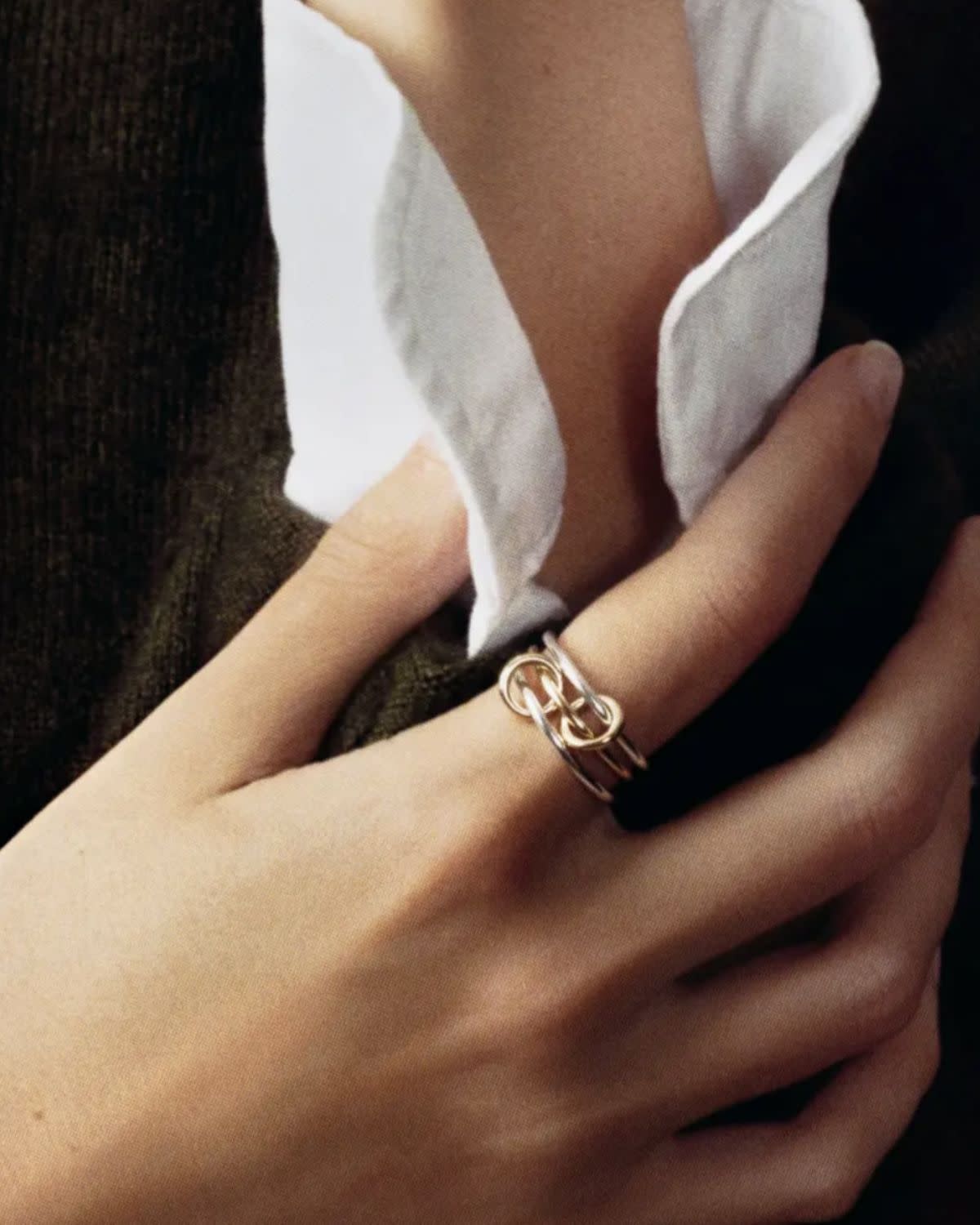 The Solarium SG ring combines a luminous, multi-tonal palette with the kinetic appeal of thin-gauged bands and connectors. Its three light gauge sterling silver bands are joined by 18k yellow gold connectors. Dynamic to its core, the Solarium SG’s modular design allows for wear on a single finger, or across several.