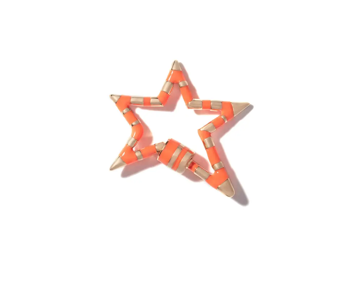 Add a touch of playful elegance to your collection with the Striped Starlock with Tacky Enamel in 14K Yellow Gold from M. Flynn. This unique star-shaped lock is crafted in solid 14K yellow gold and features bold, colorful “tacky” enamel stripes, creating a fun and eye-catching design. Perfect for adding personality to any chain, bracelet, or charm stack, this versatile piece serves as both a connector and a statement charm. Its whimsical yet sophisticated look makes it ideal for those who love to mix color and creativity in their jewelry.