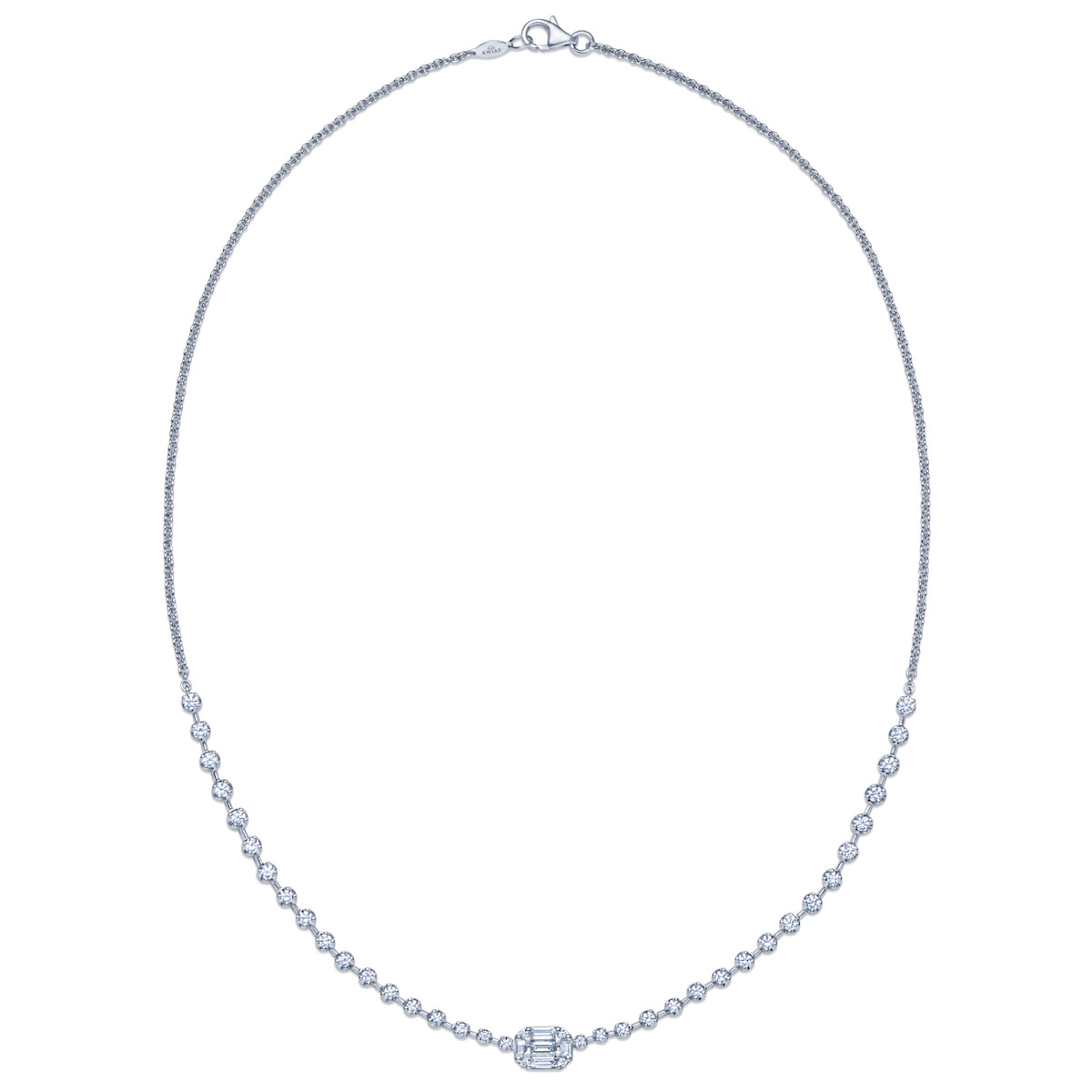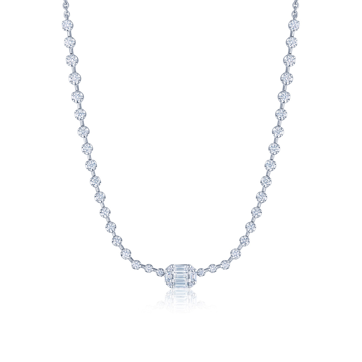 The Sunburst Demi Riviera by Kwiat features an emerald cut illusion diamond center and round brilliant diamonds stationed along each side. This is a great way to incorporate the tennis necklace look of a string of diamonds as well as a full cut diamond look from a pendant necklace. Wear this daily for everyday luxury or for your next event or big night out.