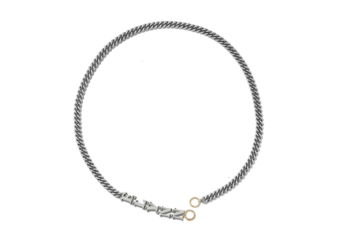 Customized Sterling Silver Marla Aaron chain with the letters FLYNN embedded into the chain and yellow gold jumprings. Are you a Flynn? Shop now, or text us to order your own – 617-292-0079.