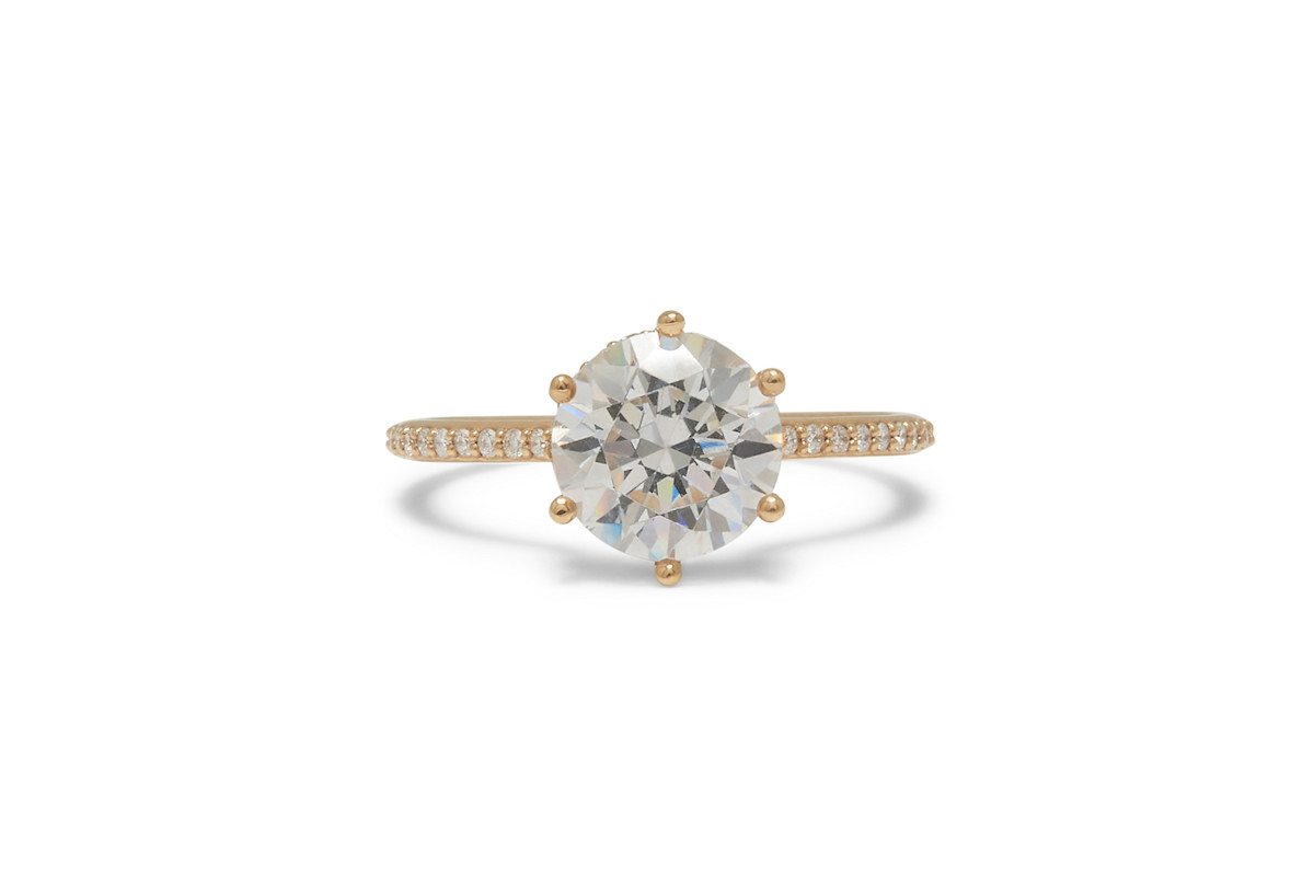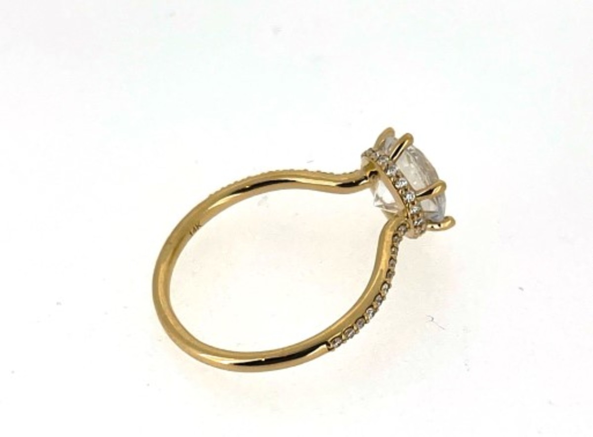 A delicate engagement ring with 6-prongs and a unique hidden halo in 14K Yellow Gold.